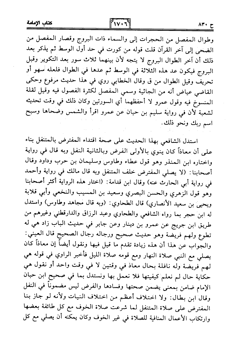 استدل الشافعي بهذا الحديث على صحة اقتداء المفترض بالمتنفل بناء على أن معاذًا كان ينوي بالأولى الفرض وبالثانية النفل وبه قال في رواية واختاره ابن المنذر وهو قول عطاء وطاوس وسليمان بن حرب وداود وقال أصحابنا: (لا يصلي المفترض خلف المتنفل وبه قال مالك في رواية وأحمد في رواية أبي الحارث عنه) وقال ابن قدامة: (اختار هذه الرواية أكثر أصحابنا وهو قول الزهري والحسن البصري وسعيد بن المسيب والنخعي وأبي قلابة ويحيى بن سعيد الأنصاري) قال الطحاوي: (وبه قال مجاهد وطاوس) واستدل له ابن حجر بما رواه الشافعي والطحاوي وعبد الرزاق والدارقطني وغيرهم من طريق ابن جريج عن عمرو بن دينار وعن جابر في حديث الباب زاد هي له تطوع ولهم فريضة وهو حديث صحيح ورجاله رجال الصحيح قال العيني: والجواب عن هذا أن هذه زيادة تقدم ما قيل فيها ونقول أيضًا إن معاذًا كان يصلي مع النبي صلاة النهار ومع قومه صلاة الليل فأخبر الراوي في قوله هي لهم فريضة وله نافلة بحال معاذ في وقتين لا في وقت واحد أو نقول هي حكاية حال لم نعلم كيفيتها فلا نعمل بها ونستدل بما في صحيح ابن حبان الإِمام ضامن بمعنى يضمن صحتها وفسادها والفرض ليس مضمونًا في النفل وقال ابن بطال: ولا اختلاف أعظم من اختلاف النيات ولأنه لو جاز بنا المفترض على صلاة المتنفل لما شرعت صلاة الخوف مع كل طائفة بعضها وارتكاب الأعمال المنافية للصلاة في غير الخوف وكان يمكنه أن يصلي مع كل