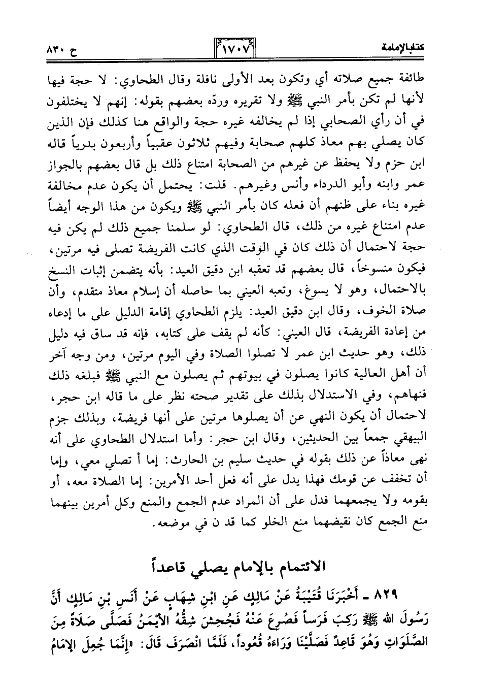 طائفة جميع صلاته أي وتكون بعد الأولى نافلة وقال الطحاوي: لا حجة فيها لأنها لم تكن بأمر النبي - صلى الله عليه وسلم - ولا تقريره وردّه بعضهم بقوله: إنهم لا يختلفون في أن رأي الصحابي إذا لم يخالفه غيره حجة والواقع هنا كذلك فإن الذين كان يصلي بهم معاذ كلهم صحابة وفيهم ثلاثون عقبيًا وأربعون بدريًا قاله ابن حزم ولا يحفظ عن غيرهم من الصحابة امتناع ذلك بل قال بعضهم بالجواز عمر وابنه وأبو الدرداء وأنس وغيرهم. قلت: يحتمل أن يكون عدم مخالفة غيره بناء على ظنهم أن فعله كان بأمر النبي - صلى الله عليه وسلم - ويكون من هذا الوجه أيضًا عدم امتناع غيره من ذلك، قال الطحاوي: لو سلمنا جميع ذلك لم يكن فيه حجة لاحتمال أن ذلك كان في الوقت الذي كانت الفريضة تصلى فيه مرتين، فيكون منسوخًا، قال بعضهم قد تعقبه ابن دقيق العيد: بأنه يتضمن إثبات النسخ بالاحتمال، وهو لا يسوغ، وتعقبه العيني بما حاصله أن إسلام معاذ متقدم، وأن صلاة الخوف، وقال ابن دقيق العيد: يلزم الطحاوي إقامة الدليل على ما إدعاه من إعادة الفريضة، قال العيني: كأنه لم يقف على كتابه، فإنه قد ساق فيه دليل ذلك، وهو حديث ابن عمر لا تصلوا الصلاة وفي اليوم مرتين، ومن وجه آخر أن أهل العالية كانوا يصلون في بيوتهم ثم يصلون مع النبي - صلى الله عليه وسلم - فبلغه ذلك فنهاهم، وفي الاستدلال بذلك على تقدير صحته نظر على ما قاله ابن حجر، لاحتمال أن يكون النهي عن أن يصلوها مرتين على أنها فريضة، وبذلك جزم البيهقي جمعًا بين الحديثين، وقال ابن حجر: وأما استدلال الطحاوي على أنه نهى معاذًا عن ذلك بقوله في حديث سليم بن الحارث: إما أن تصلي معي، وإما أن تخفف عن قومك فهذا يدل على أنه فعل أحد الأمرين: إما الصلاة معه، أو بقومه ولا يجمعهما فدل على أن المراد عدم الجمع والمنع وكل أمرين بينهما منع الجمع كان نقيضهما منع الخلو كما قد بين في موضعه.