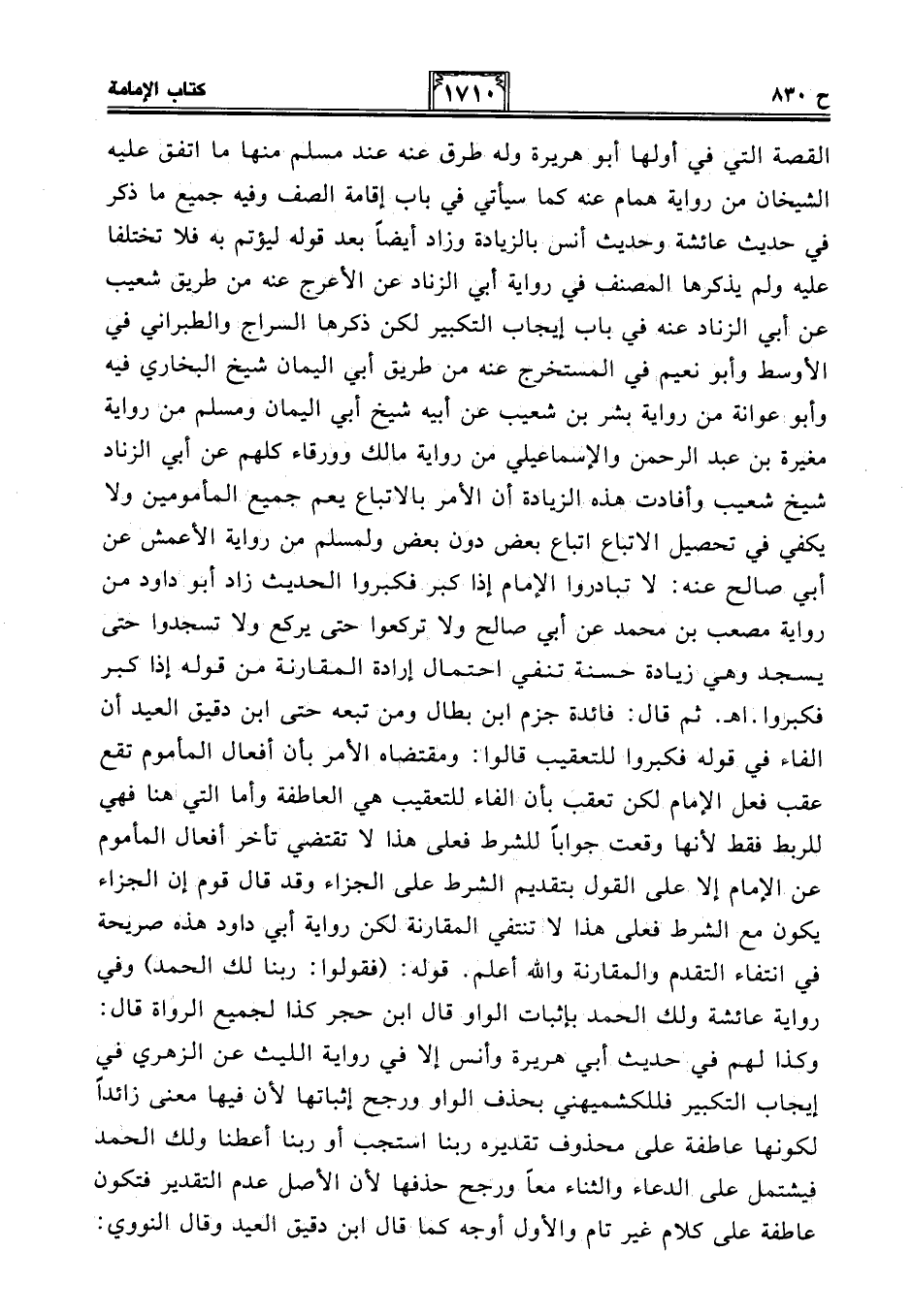 القصة التي في أولها أبو هريرة وله طرق عنه عند مسلم منها ما اتفق عليه الشيخان من رواية همام عنه كما سيأتي في باب إقامة الصف وفيه جميع ما ذكر في حديث عائشة وحديث أنس بالزيادة وزاد أيضًا بعد قوله ليؤتم به فلا تختلفا عليه ولم يذكرها المصنف في رواية أبي الزناد عن الأعرج عنه من طريق شعيب عن أبي الزناد عنه في باب إيجاب التكبير لكن ذكرها السراج والطبراني في الأوسط وأبو نعيم في المستخرج عنه من طريق أبي اليمان شيخ البخاري فيه وأبو عوانة من رواية بشر بن شعيب عن أبيه شيخ أبي اليمان ومسلم من رواية مغيرة بن عبد الرحمن والإسماعيلي من رواية مالك وورقاء كلهم عن أبي الزناد شيخ شعيب وأفادت هذه الزيادة أن الأمر بالاتباع يعم جميع المأمومين ولا يكفي في تحصيل الاتباع اتباع بعض دون بعض ولمسلم من رواية الأعمش عن أبي صالح عنه: لا تبادروا الإِمام إذا كبر فكبروا الحديث زاد أبو داود من رواية مصعب بن محمَّد عن أبي صالح ولا تركعوا حتى يركع ولا تسجدوا حتى يسجد وهي زيادة حسنة تنفي احتمال إرادة المقارنة من قوله إذا كبر فكبروا. اهـ. ثم قال: فائدة جزم ابن بطال ومن تبعه حتى ابن دقيق العيد أن الفاء في قوله فكبروا للتعقيب قالوا: ومقتضاه الأمر بأن أفعال المأموم تقع عقب فعل الإِمام لكن تعقب بأن الفاء للتعقيب هي العاطفة وأما التي هنا فهي للربط فقط لأنها وقعت جوابًا للشرط فعلى هذا لا تقتضي تأخر أفعال المأموم عن الإمام إلا على القول بتقديم الشرط على الجزاء وقد قال قوم إن الجزاء يكون مع الشرط فعلى هذا لا تنتفي المقارنة لكن رواية أبي داود هذه صريحة في انتفاء التقدم والمقارنة والله أعلم. قوله: (فقولوا: ربنا لك الحمد) وفي رواية عائشة ولك الحمد بإثبات الواو قال ابن حجر كذا لجميع الرواة قال: وكذا لهم في حديث أبي هريرة وأنس إلا في رواية الليث عن الزهري في إيجاب التكبير فللكشميهني بحذف الواو ورجح إثباتها لأن فيها معنى زائدًا لكونها عاطفة على محذوف تقديره ربنا استجب أو ربنا أعطنا ولك الحمد فيشتمل على الدعاء والثناء معًا ورجح حذفها لأن الأصل عدم التقدير فتكون عاطفة على كلام غير تام والأول أوجه كما قال ابن دقيق العيد وقال النووي: