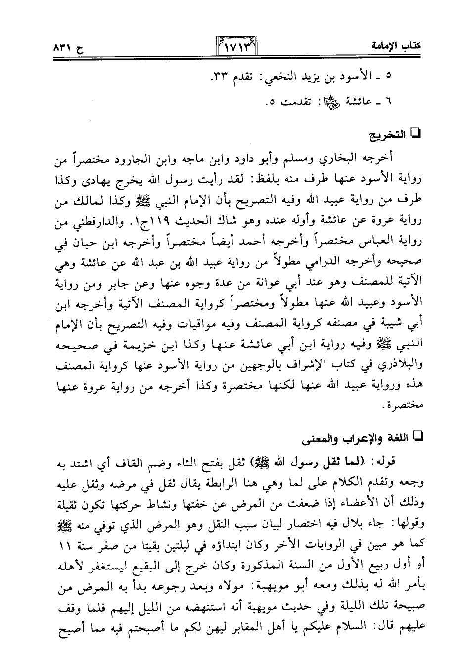 أخرجه البخاري ومسلم وأبو داود وابن ماجه وابن الجارود مختصرًا من رواية الأسود عنها طرف منه بلفظ: لقد رأيت رسول الله يخرج يهادى وكذا طرف من رواية عبيد الله وفيه التصريح بأن الإِمام النبي - صلى الله عليه وسلم - وكذا لمالك من رواية عروة عن عائشة وأوله عنده وهو شاك الحديث 119 ج 1. والدارقطني من رواية العباس مختصرا وأخرجه أحمد أيضًا مختصرا وأخرجه ابن حبان في صحيحه وأخرجه الدرامي مطولًا من رواية عبيد الله بن عبد الله عن عائشة وهي الآتية للمصنف وهو عند أبي عوانة من عدة وجوه عنها وعن جابر ومن رواية الأسود وعبيد الله عنها مطولًا ومختصرًا كرواية المصنف الآتية وأخرجه ابن أبي شيبة في مصنفه كرواية المصنف وفيه مواقيات وفيه التصريح بأن الإِمام النبي - صلى الله عليه وسلم - وفيه رواية ابن أبي عائشة عنها وكذا ابن خزيمة في صحيحه والبلاذري في كتاب الإشراف بالوجهين من رواية الأسود عنها كرواية المصنف هذه ورواية عبيد الله عنها لكنها مختصرة وكذا أخرجه من رواية عروة عنها مختصرة.