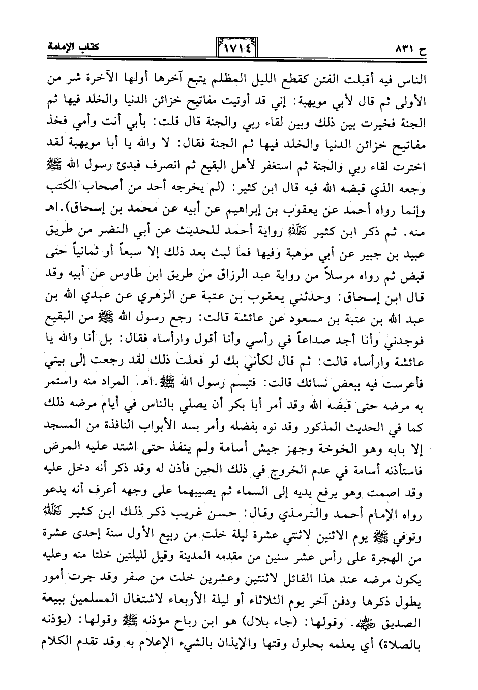 الناس فيه أقبلت الفتن كقطع الليل المظلم يتبع آخرها أولها الآخرة شر من الأولى ثم قال لأبي مويهبة: إني قد أوتيت مفاتيح خزائن الدنيا والخلد فيها ثم الجنة فخيرت بين ذلك وبين لقاء ربي والجنة قال قلت: بأبي أنت وأمي فخذ مفاتيح خزائن الدنيا والخلد فيها ثم الجنة فقال: لا والله يا أبا مويهبة لقد اخترت لقاء ربي والجنة ثم استغفر لأهل البقيع ثم انصرف فبدئ رسول الله - صلى الله عليه وسلم - وجعه الذي قبضه الله فيه قال ابن كثير: (لم يخرجه أحد من أصحاب الكتب وإنما رواه أحمد عن يعقوب بن إبراهيم عن أبيه عن محمد بن إسحاق). اهـ منه. ثم ذكر ابن كثير -رحمه الله- رواية أحمد للحديث عن أبي النضر من طريق عبيد بن جبير عن أبي موهبة وفيها فما لبث بعد ذلك إلا سبعًا أو ثمانيًا حتى قبض ثم رواه مرسلًا من رواية عبد الرزاق من طريق ابن طاوس عن أبيه وقد قال ابن إسحاق: وحدثني يعقوب بن عتبة عن الزهري عن عبدي الله بن عبد الله بن عتبة بن مسعود عن عائشة قالت: رجع رسول الله - صلى الله عليه وسلم - من البقيع فوجدني وأنا أجد صداعًا في رأسي وأنا أقول وارأساه فقال: بل أنا والله يا عائشة وارأساه قالت: ثم قال لكأني بك لو فعلت ذلك لقد رجعت إلى بيتي فأعرست فيه ببعض نسائك قالت: فتبسم رسول الله - صلى الله عليه وسلم -. اهـ. المراد منه واستمر به مرضه حتى قبضه الله وقد أمر أبا بكر أن يصلي بالناس في أيام مرضه ذلك كما في الحديث المذكور وقد نوه بفضله وأمر بسد الأبواب النافذة من المسجد إلا بابه وهو الخوخة وجهز جيش أسامة ولم ينفذ حتى اشتد عليه المرض فاستأذنه أسامة في عدم الخروج في ذلك الحين فأذن له وقد ذكر أنه دخل عليه وقد اصمت وهو يرفع يديه إلى السماء ثم يصيبهما على وجهه أعرف أنه يدعو رواه الإمام أحمد والترمذي وقال: حسن غريب ذكر ذلك ابن كثير -رحمه الله- وتوفي - صلى الله عليه وسلم - يوم الاثنين لاثنتي عشرة ليلة خلت من ربيع الأول سنة إحدى عشرة من الهجرة على رأس عشر سنين من مقدمه المدينة وقيل لليلتين خلتا منه وعليه يكون مرضه عند هذا القائل لاثنتين وعشرين خلت من صفر وقد جرت أمور يطول ذكرها ودفن آخر يوم الثلاثاء أو ليلة الأربعاء لاشتغال المسلمين ببيعة الصديق - رضي الله عنه -. وقولها: (جاء بلال) هو ابن رباح مؤذنه - صلى الله عليه وسلم - وقولها: (يؤذنه بالصلاة) أي يعلمه بحلول وقتها والإيذان بالشيء الإعلام به وقد تقدم الكلام