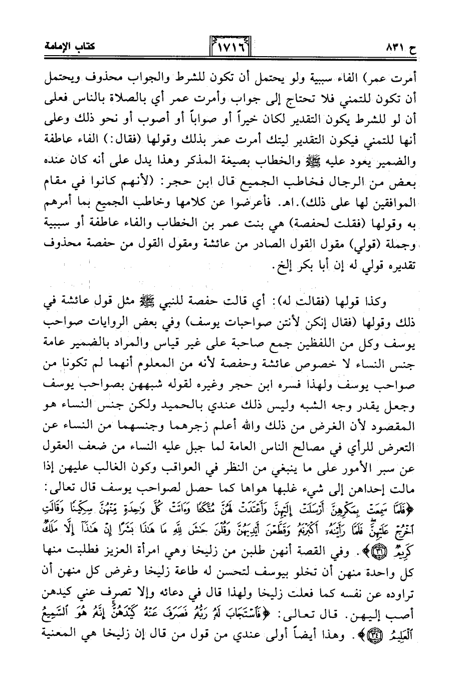 وكذا قولها (فقالت له): أي قالت حفصة للنبي - صلى الله عليه وسلم - مثل قول عائشة في ذلك وقولها (فقال إنكن لأنتن صواحبات يوسف) وفي بعض الروايات صواحب يوسف وكل من اللفظين جمع صاحبة على غير قياس والمراد بالضمير عامة جنس النساء لا خصوص عائشة وحفصة لأنه من المعلوم أنهما لم تكونا من صواحب يوسف ولهذا فسره ابن حجر وغيره لقوله شبههن بصواحب يوسف وجعل يقدر وجه الشبه وليس ذلك عندي بالحميد ولكن جنس النساء هو المقصود لأن الغرض من ذلك والله أعلم زجرهما وجنسهما من النساء عن التعرض للرأي في مصالح الناس العامة لما جبل عليه النساء من ضعف العقول عن سبر الأمور على ما ينبغي من النظر في العواقب وكون الغالب عليهن إذا مالت إحداهن إلى شيء غلبها هواها كما حصل لصواحب يوسف قال تعالى: {فَلَمَّا سَمِعَتْ بِمَكْرِهِنَّ أَرْسَلَتْ إِلَيْهِنَّ وَأَعْتَدَتْ لَهُنَّ مُتَّكَأً وَآتَتْ كُلَّ وَاحِدَةٍ مِنْهُنَّ سِكِّينًا وَقَالَتِ اخْرُجْ عَلَيْهِنَّ فَلَمَّا رَأَيْنَهُ أَكْبَرْنَهُ وَقَطَّعْنَ أَيْدِيَهُنَّ وَقُلْنَ حَاشَ لِلَّهِ مَا هَذَا بَشَرًا إِنْ هَذَا إِلَّا مَلَكٌ كَرِيمٌ (31)}. وفي القصة أنهن طلبن من زليخا وهي امرأة العزيز فطلبت منها كل واحدة منهن أن تخلو بيوسف لتحسن له طاعة زليخا وغرض كل منهن أن تراوده عن نفسه كما فعلت زليخا ولهذا قال في دعائه وإلا تصرف عني كيدهن أصب إليهن. قال تعالى: {فَاسْتَجَابَ لَهُ رَبُّهُ فَصَرَفَ عَنْهُ كَيْدَهُنَّ إِنَّهُ هُوَ السَّمِيعُ الْعَلِيمُ}. وهذا أيضًا أولى عندي من قول من قال إن زليخا هي المعنية