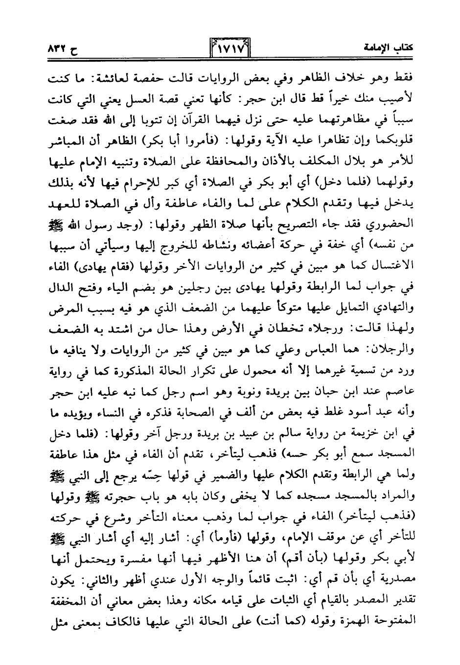 فقط وهو خلاف الظاهر وفي بعض الروايات قالت حفصة لعائشة: ما كنت لأصيب منك خيرًا قط قال ابن حجر: كأنها تعني قصة العسل يعني التي كانت سببًا في مظاهرتهما عليه حتى نزل فيهما القرآن إن تتوبا إلى الله فقد صغت قلوبكما وإن تظاهرا عليه الآية وقولها: (فأمروا أبا بكر) الظاهر أن المباشر للأمر هو بلال المكلف بالأذان والمحافظة على الصلاة وتنبيه الإِمام عليها وقولهما (فلما دخل) أي أبو بكر في الصلاة أي كبر للإحرام فيها لأنه بذلك يدخل فيها وتقدم الكلام على لما والفاء عاطفة وأل في الصلاة للعهد الحضوري فقد جاء التصريح بأنها صلاة الظهر وقولها: (وجد رسول الله - صلى الله عليه وسلم - من نفسه) أي خفة في حركة أعضائه ونشاطه للخروج إليها وسيأتي أن سببها الاغتسال كما هو مبين في كثير من الروايات الأخر وقولها (فقام يهادى) الفاء في جواب لما الرابطة وقولها يهادى بين رجلين هو بضم الياء وفتح الدال والتهادي التمايل عليها متوكأ عليهما من الضعف الذي هو فيه بسبب المرض ولهذا قالت: ورجلاه تخطان في الأرض وهذا حال من اشتد به الضعف والرجلان: هما العباس وعلي كما هو مبين في كثير من الروايات ولا ينافيه ما ورد من تسمية غيرهما إلا أنه محمول على تكرار الحالة المذكورة كما في رواية عاصم عند ابن حبان بين بريدة ونوبة وهو اسم رجل كما نبه عليه ابن حجر وأنه عبد أسود غلط فيه بعض من ألف في الصحابة فذكره في النساء ويؤيده ما في ابن خزيمة من رواية سالم بن عبيد بن بريدة ورجل آخر وقولها: (فلما دخل المسجد سمع أبو بكر حسه) فذهب ليتأخر، تقدم أن الفاء في مثل هذا عاطفة ولما هي الرابطة وتقدم الكلام عليها والضمير في قولها حِسّه يرجع إلى النبي - صلى الله عليه وسلم - والمراد بالمسجد مسجده كما لا يخفى وكان بابه هو باب حجرته - صلى الله عليه وسلم - وقولها (فذهب ليتأخر) الفاء في جواب لما وذهب معناه التأخر وشرع في حركته للتأخر أي عن موقف الإمام، وقولها (فأومأ) أي: أشار إليه أي أشار النبي - صلى الله عليه وسلم - لأبي بكر وقولها (بأن أقم) أن هنا الأظهر فيها أنها مفسرة ويحتمل أنها مصدرية أي بأن قم أي: اثبت قائمًا والوجه الأول عندي أظهر والثاني: يكون تقدير المصدر بالقيام أي الثبات على قيامه مكانه وهذا بعض معاني أن المخففة المفتوحة الهمزة وقوله (كما أنت) على الحالة التي عليها فالكاف بمعنى مثل