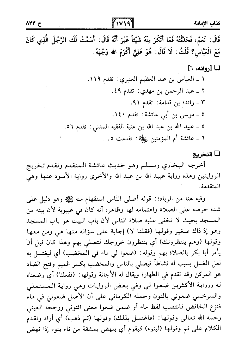 وفيه هنا من الزيادة: قوله أصلى الناس استفهام منه - صلى الله عليه وسلم - وهو دليل على شدة حرصه على الصلاة واهتمامه لها وظاهره أنه كان في غيبوبة لأن بيته من المسجد بحيث لا تخفى عليه صلاة الناس لأن باب البيت هو باب المسجد وهو إذ ذاك صغير وقولها (فقلنا لا) إجابة على سؤاله منها هي ومن معها وقولها (وهم ينتظرونك) أي ينتظرون خروجك لتصلي بهم وهذا كان قبل أن يأمر أبا بكر بالصلاة بهم وقوله: (ضعوا لي ماء في المخضب) أي ليغتسل به لعل الغسل يسبب له نشاطًا فيصلي بالناس والمخضب بكسر الميم وفتح الضاد هو المركن وقد تقدم في الطهارة ويقال له الأجانة وقولها: (ففعلنا) أي وضعناه له ورواية الأكثرين ضعوا لي وفي بعض الروايات وهي رواية المستملي والسرخسي ضعوني بالنون وحمله الكرماني على أن الأصل ضعوني في ماء فنزع الخافض فانتصب لفظ ماء أو ضمن ضعوا معنى ائتوني ورجحه العيني -رحمه الله تعالى- وقولها: (فاغتسل بذلك) وقولها (ثم ذهب) أي أراد وتقدم الكلام على ثم وقولها (لينوء) كيقوم أي ينهض بمشقة من ناء ينوء إذا نهض
