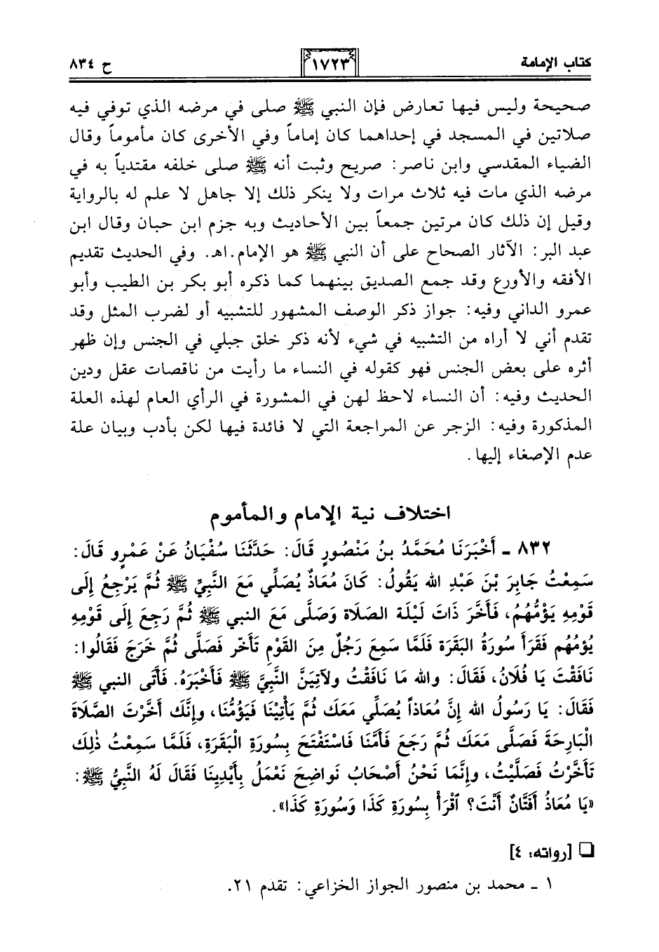 832 - أَخْبَرَنَا مُحَمَّدُ بْنُ مَنْصُورٍ قَالَ: حَدَّثَنَا سُفْيَانُ عَنْ عَمْرٍو قَالَ: سَمِعْتُ جَابِرَ بْنَ عَبْدِ اللَّهِ يَقُولُ: كَانَ مُعَاذٌ يُصَلِّي مَعَ النَّبِيِّ - صلى الله عليه وسلم - ثُمَّ يَرْجِعُ إِلَى قَوْمِهِ يَؤُمُّهُمْ، فَأَخَّرَ ذَاتَ لَيْلَةٍ الصَّلَاةَ وَصَلَّى مَعَ النَّبِيِّ - صلى الله عليه وسلم - ثُمَّ رَجَعَ إِلَى قَوْمِهِ يَؤُمُّهُمْ فَقَرَأَ سُورَةَ الْبَقَرَةِ فَلَمَّا سَمِعَ رَجُلٌ مِنَ الْقَوْمِ تَأَخَّرَ فَصَلَّى ثُمَّ خَرَجَ فَقَالُوا: نَافَقْتَ يَا فُلَانُ، فَقَالَ: وَاللَّهِ مَا نَافَقْتُ وَلآتِيَنَّ النَّبِيَّ - صلى الله عليه وسلم - فَأُخْبِرُهُ. فَأَتَى النَّبِيَّ - صلى الله عليه وسلم - فَقَالَ: يَا رَسُولَ اللَّهِ إِنَّ مُعَاذًا يُصَلِّي مَعَكَ ثُمَّ يَأْتِينَا فَيَؤُمُّنَا، وَإِنَّكَ أَخَّرْتَ الصَّلَاةَ الْبَارِحَةَ فَصَلَّى مَعَكَ ثُمَّ رَجَعَ فَأَمَّنَا فَاسْتَفْتَحَ بِسُورَةِ الْبَقَرَةِ، فَلَمَّا سَمِعْتُ ذَلِكَ تَأَخَّرْتُ فَصَلَّيْتُ، وَإِنَّمَا نَحْنُ أَصْحَابُ نَوَاضِحَ نَعْمَلُ بِأَيْدِينَا فَقَالَ لَهُ النَّبِيُّ - صلى الله عليه وسلم -: "يَا مُعَاذُ أَفَتَّانٌ أَنْتَ؟ اقْرَأْ بِسُورَةِ كَذَا وَسُورَةِ كَذَا".