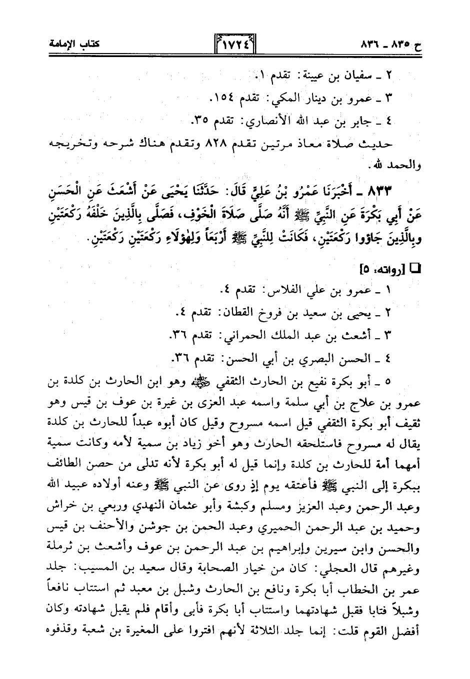 833 - أَخْبَرَنَا عَمْرُو بْنُ عَلِيٍّ قَالَ: حَدَّثَنَا يَحْيَى عَنْ أَشْعَثَ عَنِ الْحَسَنِ عَنْ أَبِي بَكْرَةَ عَنِ النَّبِيِّ - صلى الله عليه وسلم - أَنَّهُ صَلَّى صَلَاةَ الْخَوْفِ، فَصَلَّى بِالَّذِينَ خَلْفَهُ رَكْعَتَيْنِ وَبِالَّذِينَ جَاءُوا رَكْعَتَيْنِ، فَكَانَتْ لِلنَّبِيِّ - صلى الله عليه وسلم - أَرْبَعًا وَلِهَؤُلَاءِ رَكْعَتَيْنِ رَكْعَتَيْنِ.