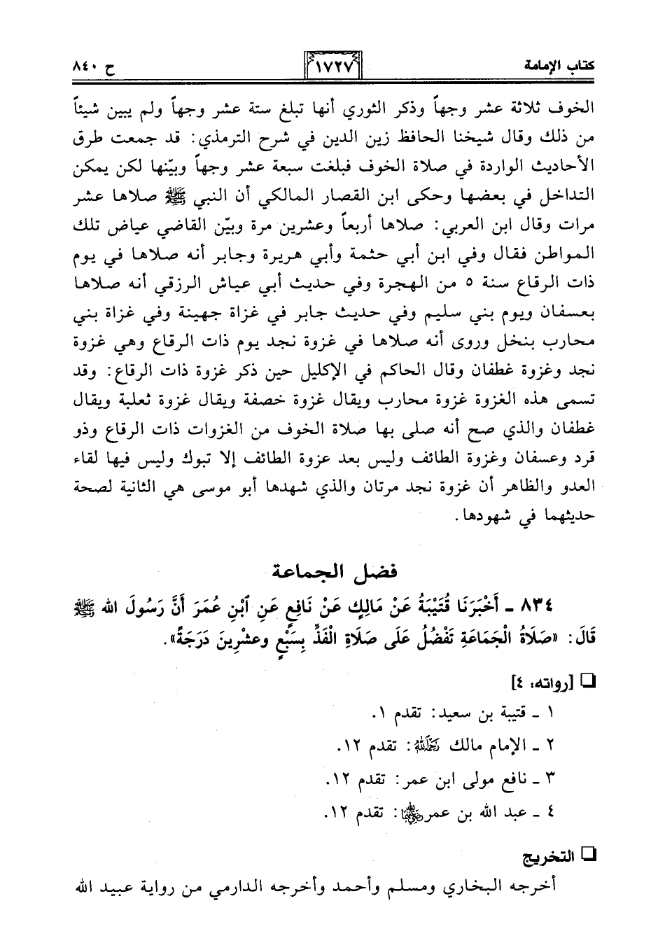 834 - أَخْبَرَنَا قُتَيْبَةُ عَنْ مَالِكٍ عَنْ نَافِعٍ عَنِ ابْنِ عُمَرَ أَنَّ رَسُولَ اللَّهِ - صلى الله عليه وسلم - قَالَ: "صَلَاةُ الْجَمَاعَةِ تَفْضُلُ عَلَى صَلَاةِ الْفَذِّ بِسَبْعٍ وَعِشْرِينَ دَرَجَةً".