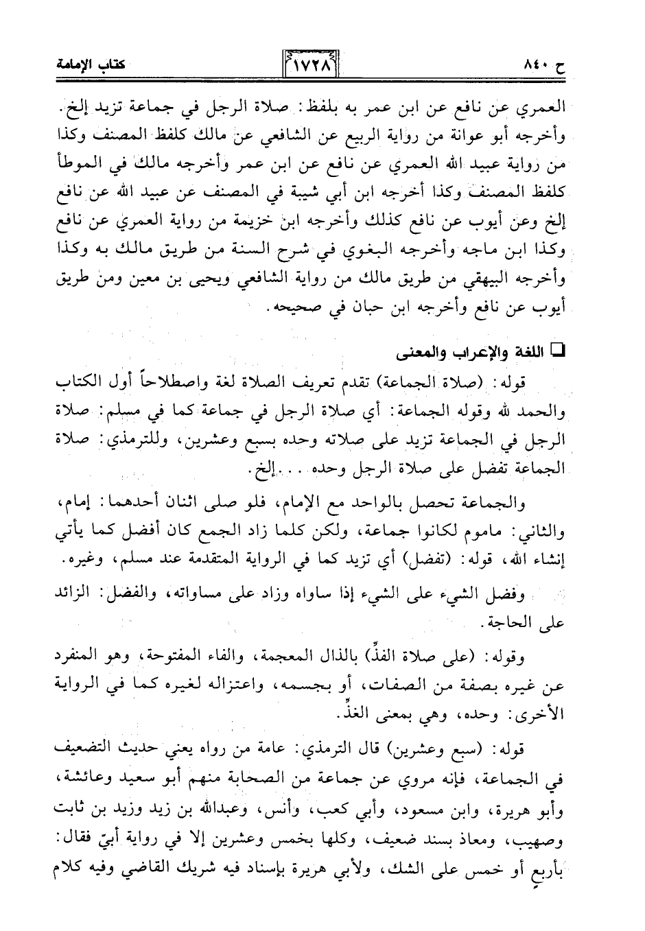 قوله: (صلاة الجماعة) تقدم تعريف الصلاة لغة واصطلاحا أول الكتاب والحمد لله وقوله الجماعة: أي صلاة الرجل في جماعة كما في مسلم: صلاة الرجل في الجماعة تزيد على صلاته وحده بسبع وعشرين، وللترمذي: صلاة الجماعة تفضل على صلاة الرجل وحده. . . إلخ.