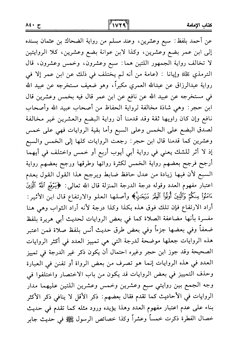 عن أحمد بلفظ: سبع وعشرين، وعند مسلم من رواية الضحاك بن عثمان بسنده إلى ابن عمر بضع وعشرين، وكذا لابن عوانة بضع وعشرين، كلا الروايتين لا تخالف رواية الجمهور اللتين هما: سبع وعشرون، وخمس وعشرون، قال الترمذي رحمه الله وإيانا: (عامة من أنه لم يختلف في ذلك عن ابن عمر إلا في رواية عبد الرزاق عن عبد الله العمري مكبرًا، وهو ضعيف مستخرجه عن عبيد الله في مستخرجه عن عبيد الله عن نافع عن ابن عمر قال فيه بخمس وعشرين قال ابن حجر: وهي شاذة مخالفة لرواية الحفاظ من أصحاب عبيد الله وأصحاب نافع وإن كان راويها ثقة وقد قدمنا أن رواية البضع والعشرين غير مخالفة لصدق البضع على الخمس وعلى السبع وأما بقية الروايات فهي على خمس وعشرين كما قدمنا قال ابن حجر: رجعت الروايات كلها إلى الخمس والسبع إذ لا أثر للشك يعني في رواية أبي أيوب أربع أو خمس واختلف في أيهما أرجح فرجح بعضهم رواية الخمس لكثرة رواتها وطرقها ورجح بعضهم رواية السبع لأن فيها زيادة من عدل حافظ ضابط ويرجح هذا القول القول بعدم اعتبار مفهوم العدد وقوله درجة الدرجة المنزلة قال الله تعالى: {يَرْفَعِ اللَّهُ الَّذِينَ آمَنُوا مِنْكُمْ وَالَّذِينَ أُوتُوا الْعِلْمَ دَرَجَاتٍ} وأصلها العلو والارتفاع قال ابن الأثير: أراد الارتفاع فإن تلك فوق هذه بكذا وكذا درجة لأنه أراد الثواب وهي هنا مفسرة بأنها مضاعفة الصلاة كما في بعض الروايات لحديث أبي هريرة بلفظ ضعفًا وفي بعضها جزءًا وفي بعض طرق حديث أنس بلفظ صلاة فمن اعتبر هذه الروايات جعلها موضحة لدرجة التي هي تمييز العدد في أكثر الروايات الصحيحة وقد جوز ابن حجر وغيره احتمال أن يكون ذكر غير الدرجة في تمييز العدد في هذه الروايات إنما هو تصرف من بعض الرواة أو تفنن في العبارة وحذف التمييز في بعض الروايات قد يكون من باب الاختصار واختلفوا في وجه الجمع بين روايتي سبع وعشرين وخمس وعشرين اللتين عليهما مدار الروايات في الأحاديث كما تقدم فقال بعضهم: ذكر الأقل لا ينافي ذكر الأكثر بناء على عدم اعتبار مفهوم العدد وهذا يؤيده ورود مثله كما تقدم في حديث خصال الفطرة ذكرت خمسًا وعشرًا وكذا خصائص الرسول - صلى الله عليه وسلم - في حديث جابر