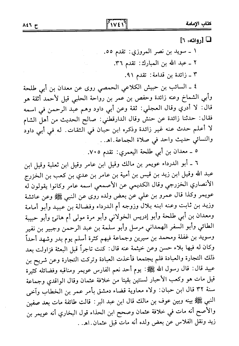 4 - السائب بن حبيش الكلاعي الحمصي روى عن معدان بن أبي طلحة وأبي الشماخ وعنه زائدة وحفص بن عمر بن رواحة الحلبي قيل لأحمد أثقة هو قال: لا أدري وقال العجلي: ثقة وعن أبي داود وهم عبد الرحمن في اسمه فقال: حدثنا زائدة عن حنش وقال الدارقطني: صالح الحديث من أهل الشام لا أعلم حدث عنه غير زائدة وذكره ابن حبان في الثقات. له في أبي داود والنسائي حديث واحد في صلاة الجماعة. اهـ.