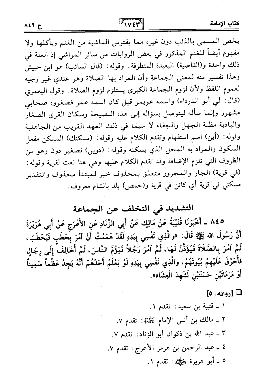 يخص المسمى بالذئب دون غيره مما يفترس الماشية من الغنم ويأكلها ولا مفهوم أيضًا للغنم المذكور في بعض الروايات من سائر المواشي إذ العلة في ذلك واحدة و (القاصية) البعيدة المتطرفة. وقوله: (قال السائب) هو ابن حبيش وهذا تفسير منه لمعنى الجماعة وأن المراد بها الصلاة وهو عندي غير وجيه لعموم اللفظ ولأن لزوم الجماعة الكبرى يستلزم لزوم الصلاة. وقول اليعمري (قال: لي أبو الدرداء) واسمه عويمر قيل كان اسمه عمر فصغروه صحابي مشهور وإنما سأله ليتوصل بسؤاله إلى هذه النصيحة وسكان القرى الصغار والبادية مظنة الجهل والجفاء لاسيما في ذلك العهد القريب من الجاهلية وقوله: (أين) اسم استفهام وتقدم الكلام عليه وقوله: (مسكنك) المسكن مفعل السكون والمراد به المحل الذي يسكنه وقوله: (دوين) تصغير دون وهو من الظروف التي تلزم الإضافة وقد تقدم الكلام عليها وهي هنا نعت لقرية وقوله: (في قرية) الجار والمجرور متعلق بمحذوف خبر لمبتدأ محذوف والتقدير مسكني في قرية أي كائن في قرية و (حمص) بلد بالشام معروف.
