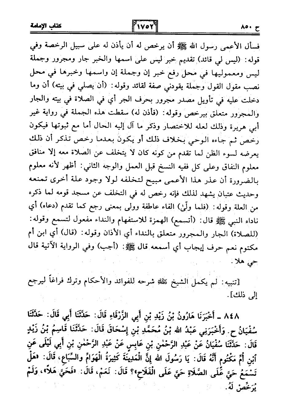 848 - أَخْبَرَنَا هَارُونُ بْنُ زَيْدِ بْنِ أَبِي الزَّرْقَاءِ قَالَ: حَدَّثَنَا أَبِي قَالَ: حَدَّثَنَا سُفْيَانُ ح. وَأَخْبَرَنِي عَبْدُ اللَّهِ بْنُ مُحَمَّدِ بْنِ إِسْحَاقَ قَالَ: حَدَّثَنَا قَاسِمُ بْنُ زَيْدٍ قَالَ: حَدَّثَنَا سُفْيَانُ عَنْ عَبْدِ الرَّحْمَنِ بْنِ عَابِسٍ عَنْ عَبْدِ الرَّحْمَنِ بْنِ أَبِي لَيْلَى عَنِ ابْنِ أُمِّ مَكْتُومٍ أَنَّهُ قَالَ: يَا رَسُولَ اللَّهِ إِنَّ الْمَدِينَةَ كَثِيرَةُ الْهَوَامِّ وَالسِّبَاعِ، قَالَ: "هَلْ تَسْمَعُ حَيَّ عَلَى الصَّلَاةِ حَيَّ عَلَى الْفَلَاحِ"؟ قَالَ: نَعَمْ، قَالَ: "فَحَيَّ هَلًا"، وَلَمْ يُرَخِّصْ لَهُ.