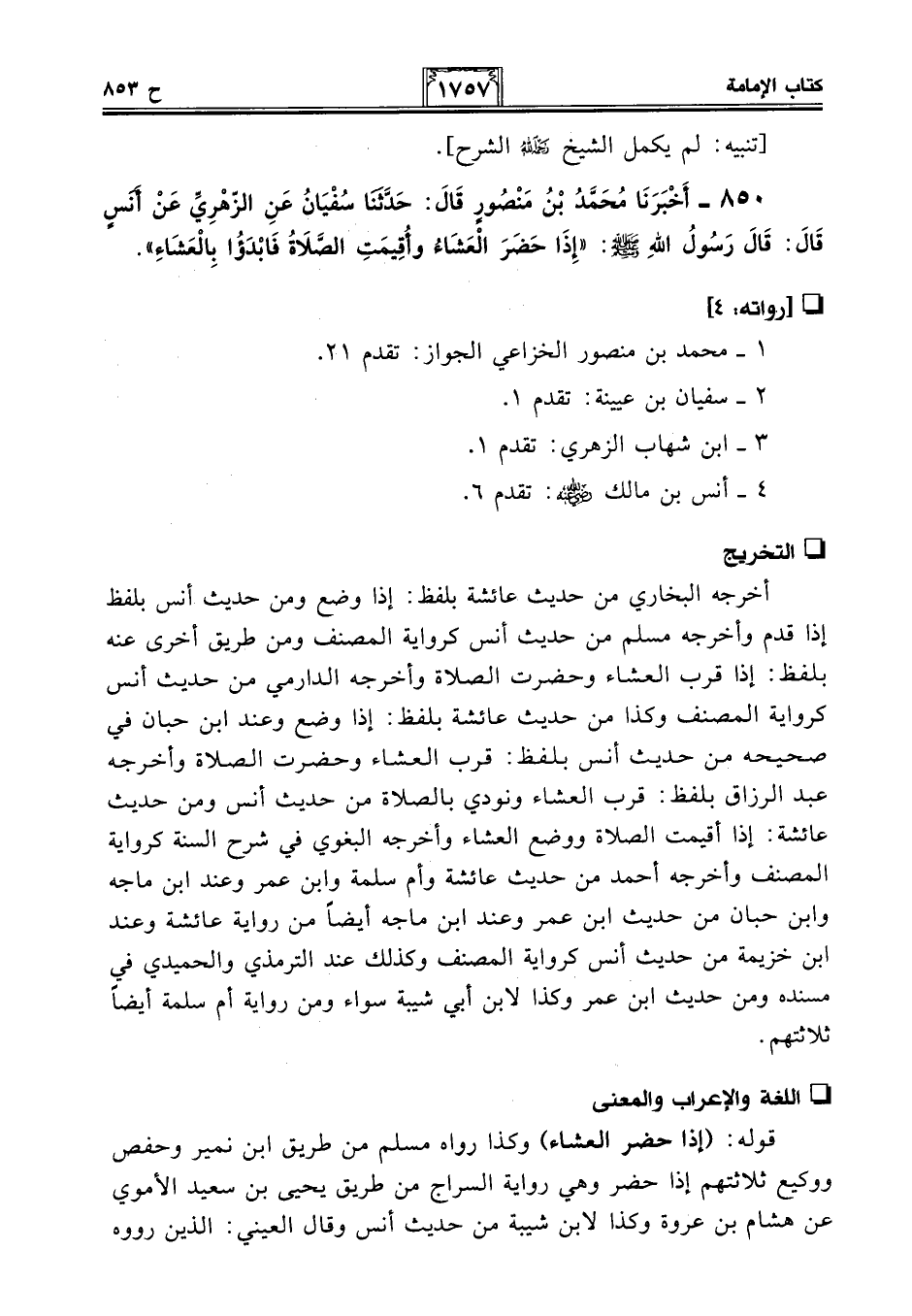 850 - أَخْبَرَنَا مُحَمَّدُ بْنُ مَنْصُورٍ قَالَ: حَدَّثَنَا سُفْيَانُ عَنِ الزُّهْرِيِّ عَنْ أَنَسٍ قَالَ: قَالَ رَسُولُ اللَّهِ - صلى الله عليه وسلم -: "إِذَا حَضَرَ الْعَشَاءُ وَأُقِيمَتِ الصَّلَاةُ فَابْدَءُوا بِالْعَشَاءِ".
