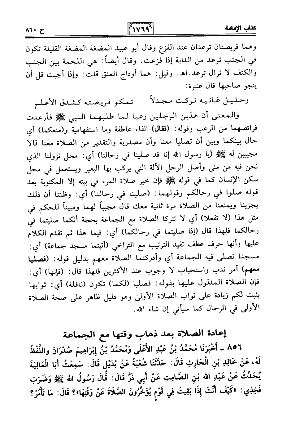 والمعنى أن هذين الرجلين رعبا لما طلبهما النبي - صلى الله عليه وسلم - فأرعدت فرائصهما من الرعب وقوله: (فقال) الفاء عاطفة وما استفهامية و (منعكما) أي حال بينكما وبين أن تصليا معنا وأن مصدرية والتقدير من الصلاة معنا قالا مجيبين له - صلى الله عليه وسلم - (يا رسول الله إنا قد صلينا في رحالنا) أي: محل نزولنا الذي نحن فيه من منى وأصل الرحل الآلة التي يركب بها البعير ويستعمل في محل سكن الإنسان كما في قوله - صلى الله عليه وسلم - فإن خير صلاة المرء في بيته إلا المكتوبة بعد قوله صلوا في رحالكم وقولهما: (صلينا في رحالنا) أي: وظننا أن ذلك يجزينا ويمنعنا من الصلاة مرة ثانية معك قال مجيبًا لهما ومبينًا للحكم في مثل هذا (لا تفعلا) أي لا تتركا الصلاة مع الجماعة بحجة أنكلما صليتما في رحالكما فلهذا قال (إذا صليتما في رحالكما) أي: فيما هذا ثم تقدم الكلام عليها وأنها حرف عطف تفيد الترتيب مع التراخي (أتيتما مسجد جماعة) أي: مسجدًا تصلى فيه الجماعة أي وأدركتما الصلاة معهم بدليل قوله: (فصليا معهم) أمر ندب واستحباب لا وجوب عند الأكثرين فلهذا قال: (فإنها) أي: فإن الصلاة المدلول عليها بقوله: فصليا (لكما) تكون (نافلة) أي: ثوابها يثبت لكم زيادة على ثواب الصلاة الأولى وهو دليل ظاهر طى صحة الصلاة الأولى في الرحال كما سيأتي إن شاء الله.