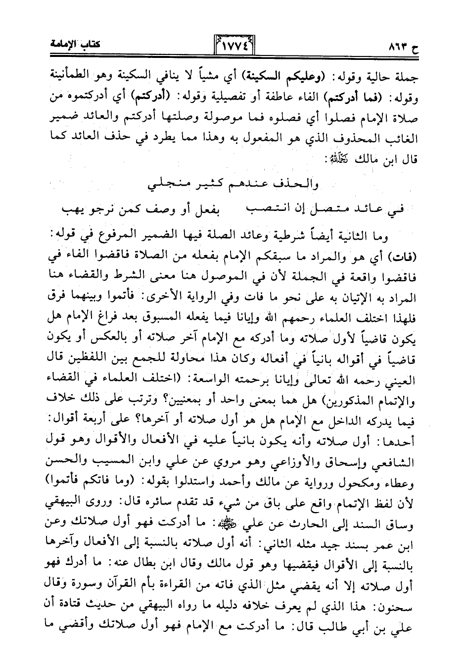 وما الثانية أيضًا شرطية وعائد الصلة فيها الضمير المرفوع في قوله: (فات) أي هو والمراد ما سبقكم الإِمام بفعله من الصلاة فاقضوا الفاء في فاقضوا واقعة في الجملة لأن في الموصول هنا معنى الشرط والقضاء هنا المراد به الإتيان به على نحو ما فات وفي الرواية الأخرى: فأتموا وبينهما فرق فلهذا اختلف العلماء رحمهم الله وإيانا فيما يفعله المسبوق بعد فراغ الإِمام هل يكون قاضيًا لأول صلاته وما أدركه مع الإِمام آخر صلاته أو بالعكس أو يكون قاضيًا في أقواله بانيًا في أفعاله وكان هذا محاولة للجمع بين اللفظين قال العيني رحمه الله تعالى وإيانا برحمته الواسعة: (اختلف العلماء في القضاء والإتمام المذكورين) هل هما بمعنى واحد أو بمعنيين؟ وترتب على ذلك خلاف فيما يدركه الداخل مع الإِمام هل هو أول صلاته أو آخرها؟ على أربعة أقوال: أحدها: أول صلاته وأنه يكون بانيًا عليه في الأفعال والأقوال وهو قول الشافعي وإسحاق والأوزاعي وهو مروي عن علي وابن المسيب والحسن وعطاء ومكحول ورواية عن مالك وأحمد واستدلوا بقوله: (وما فاتكم فأتموا) لأن لفظ الإتمام واقع على باق من شيء قد تقدم سائره قال: وروى البيهقي وساق السند إلى الحارث عن علي - رضي الله عنه -: ما أدركت فهو أول صلاتك وعن ابن عمر بسند جيد مثله الثاني: أنه أول صلاته بالنسبة إلى الأفعال وآخرها بالنسبة إلى الأقوال فيقضيها وهو قول مالك وقال ابن بطال عنه: ما أدرك فهو أول صلاته إلا أنه يقضي مثل الذي فاته من القراءة بأم القرآن وسورة وقال سحنون: هذا الذي لم يعرف خلافه دليله ما رواه البيهقي من حديث قتادة أن علي بن أبي طالب قال: ما أدركت مع الإِمام فهو أول صلاتك وأقضي ما