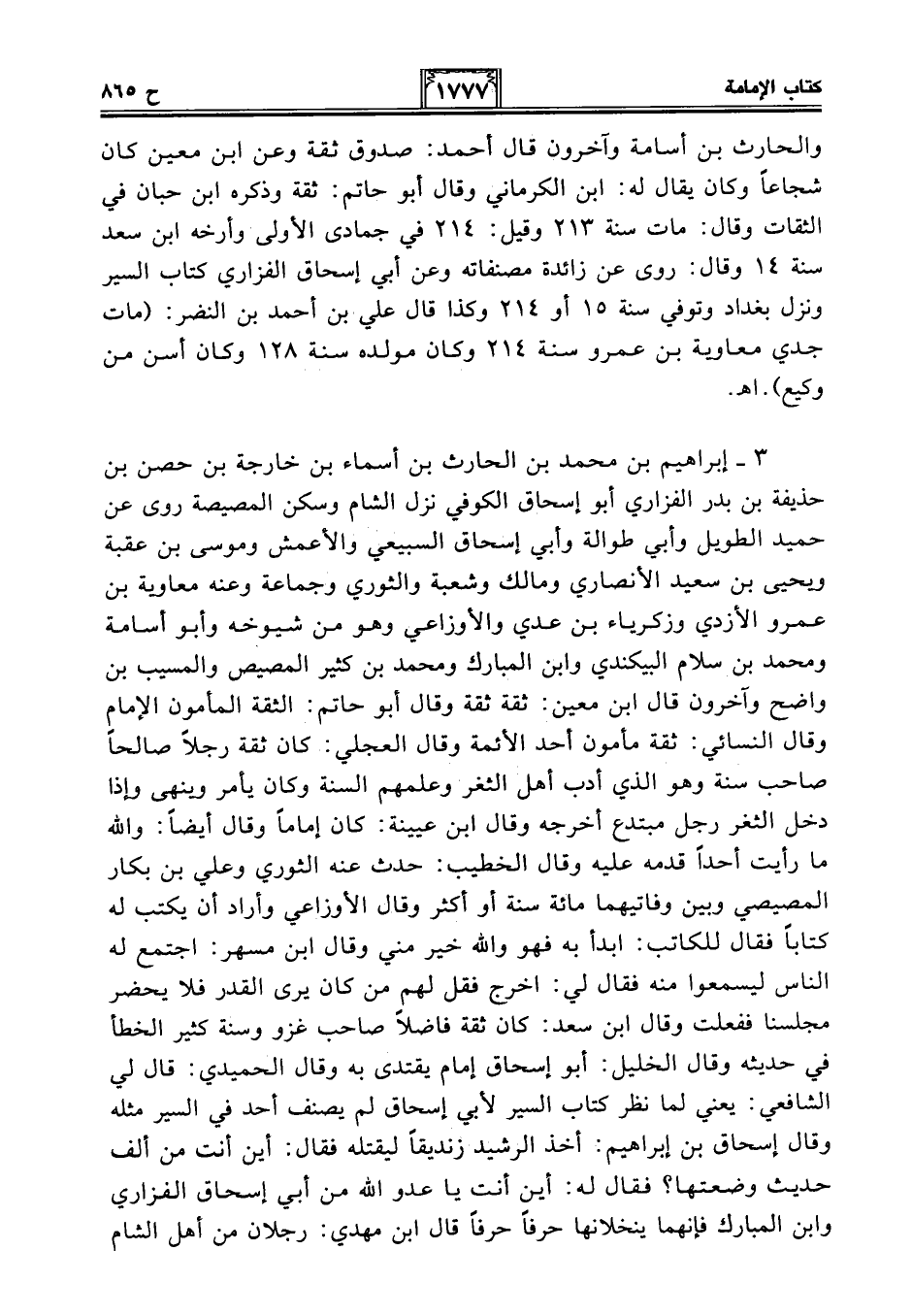 3 - إبراهيم بن محمَّد بن الحارث بن أسماء بن خارجة بن حصن بن حذيفة بن بدر الفزاري أبو إسحاق الكوفي نزل الشام وسكن المصيصة روى عن حميد الطويل وأبي طوالة وأبي إسحاق السبيعي والأعمش وموسى بن عقبة ويحيى بن سعيد الأنصاري ومالك وشعبة والثوري وجماعة وعنه معاوية بن عمرو الأزدي وزكرياء بن عدي والأوزاعي وهو من شيوخه وأبو أسامة ومحمد بن سلام البيكندي وابن المبارك ومحمد بن كثير المصيص والمسيب بن واضح وآخرون قال ابن معين: ثقة ثقة وقال أبو حاتم: الثقة المأمون الإِمام وقال النسائي: ثقة مأمون أحد الأئمة وقال العجلي: كان ثقة رجلًا صالحًا صاحب سنة وهو الذي أدب أهل الثغر وعلمهم السنة وكان يأمر وينهى وإذا دخل الثغر رجل مبتدع أخرجه وقال ابن عيينة: كان إمامًا وقال أيضًا: والله ما رأيت أحدًا قدمه عليه وقال الخطيب: حدث عنه الثوري وعلي بن بكار المصيصي وبين وفاتيهما مائة سنة أو أكثر وقال الأوزاعي وأراد أن يكتب له كتابًا فقال للكاتب: ابدأ به فهو والله خير مني وقال ابن مسهر: اجتمع له الناس ليسمعوا منه فقال لي: اخرج فقل لهم من كان يرى القدر فلا يحضر مجلسنا ففعلت وقال ابن سعد: كان ثقة فاضلًا صاحب غزو وسنة كثير الخطأ في حديثه وقال الخليل: أبو إسحاق إمام يقتدى به وقال الحميدي: قال لي الشافعي: يعني لما نظر كتاب السير لأبي إسحاق لم يصنف أحد في السير مثله وقال إسحاق بن إبراهيم: أخذ الرشيد زنديقًا ليقتله فقال: أين أنت من ألف حديث وضعتها؟ فقال له: أين أنت يا عدو الله من أبي إسحاق الفزاري وابن المبارك فإنهما ينخلانها حرفًا حرفًا قال ابن مهدي: رجلان من أهل الشام