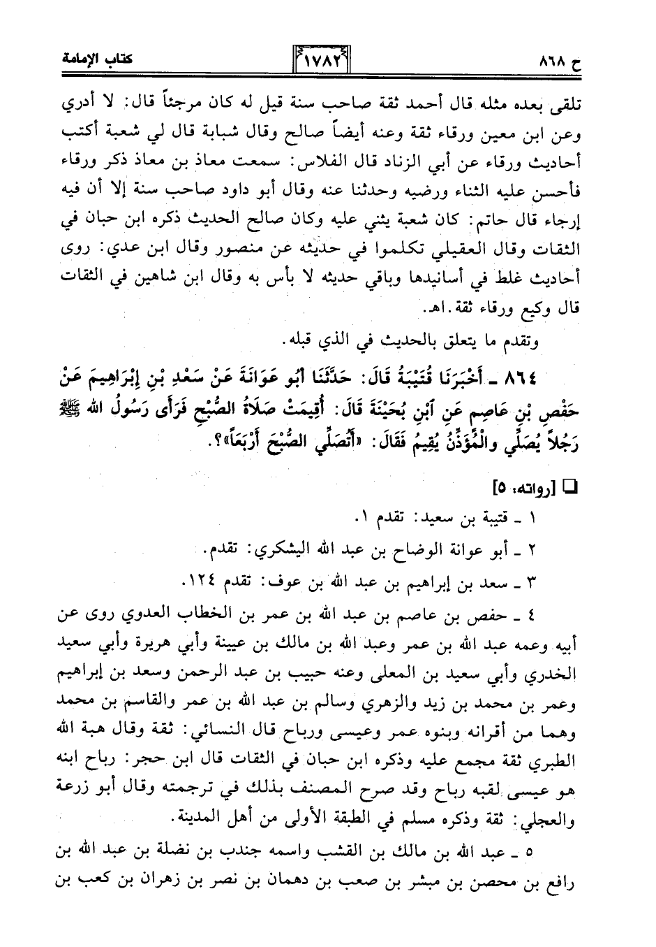 864 - أَخْبَرَنَا قُتَيْبَةُ قَالَ: حَدَّثَنَا أبُو عَوَانَةَ عَنْ سَعْدِ بْنِ اِبْرَاهِيمَ عَنْ حَفْصِ بْن عَاصِم عَنِ ابْنِ بُحَيْنَةَ قَالَ: أقِيمَتْ صَلَاةُ الصُّبحِ فَرَأى رَسُولُ الله - صلى الله عليه وسلم - رَجُلًا يُصلِّي والْمُؤَذن يُقِيمُ فَقَالَ: "أَتُصَلِّي الصُّبْحَ أَرْبَعًا"؟ .