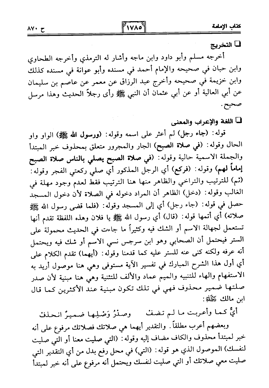 قوله: (جاء رجل) لم أعثر على اسمه وقوله: (ورسول الله - صلى الله عليه وسلم -) الواو واو الحال وقوله: (في صلاة الصبح) الجار والمجرور متعلق بمحذوف خبر المبتدأ والجملة الاسمية حالية وقوله: (في صلاة الصبح يصلي بالناس صلاة الصبح إمامًا لهم) وقوله: (فركع) أي الرجل المذكور أي صلى ركعتي الفجر وقوله: (ثم) للترتيب والتراخي والظاهر منها هنا الترتيب فقط لعدم وجود مهلة في الغالب وقوله: (دخل) الظاهر أن المراد دخوله في الصلاة لأن دخول المسجد حصل في قوله: (جاء رجل) أي إلى المسجد وقوله: (فلما قضى رسول الله - صلى الله عليه وسلم - صلاته) أي أتمها قوله: (قال) أي رسول الله - صلى الله عليه وسلم - يا فلان وهذه اللفظة تقدم أنها تستعمل لجهالة الاسم أو الشك فيه وكثيرًا ما جاءت في الحديث محمولة على الستر فيحتمل أن الصحابي، وهو ابن سرجس نسي الاسم أو شك فيه ويحتمل أنه عرفه ولكنه كنى عنه للستر عليه كما قدمنا وقوله: (أيهما) تقدم الكلام على أي أول هذا الشرح المبارك في تفسير الآية مستوفى وهي هنا موصول أريد به الاستفهام والهاء للتنبيه والميم عماد والألف للتثنية وهي هنا مبنية لأن صدر صلتها ضمير محذوف فهي في تلك تكون مبنية عند الأكثرين كما قال ابن مالك -رحمه الله-: