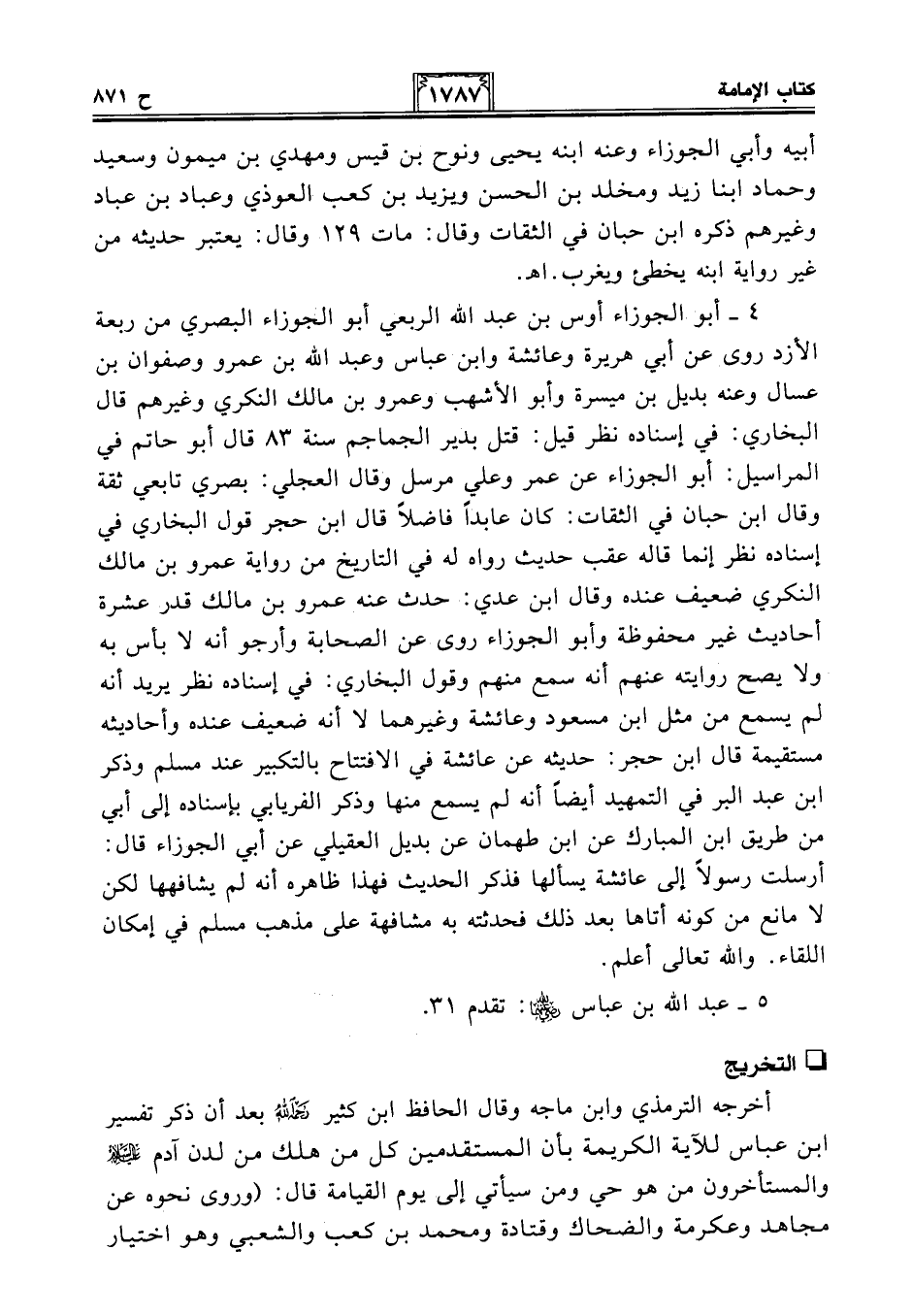 4 - أبو الجوزاء أوس بن عبد الله الربعي أبو الجوزاء البصري من ربعة الأزد روى عن أبي هريرة وعائشة وابن عباس وعبد الله بن عمرو وصفوان بن عسال وعنه بديل بن ميسرة وأبو الأشهب وعمرو بن مالك النكري وغيرهم قال البخاري: في إسناده نظر قيل: قتل بدير الجماجم سنة 83 قال أبو حاتم في المراسيل: أبو الجوزاء عن عمر وعلي مرسل وقال العجلي: بصري تابعي ثقة وقال ابن حبان في الثقات: كان عابدًا فاضلًا قال ابن حجر قول البخاري في إسناده نظر إنما قاله عقب حديث رواه له في التاريخ من رواية عمرو بن مالك النكري ضعيف عنده وقال ابن عدي: حدث عنه عمرو بن مالك قدر عشرة أحاديث غير محفوظة وأبو الجوزاء روى عن الصحابة وأرجو أنه لا بأس به ولا يصح روايته عنهم أنه سمع منهم وقول البخاري: في إسناده نظر يريد أنه لم يسمع من مثل ابن مسعود وعائشة وغيرهما لا أنه ضعيف عنده وأحاديثه مستقيمة قال ابن حجر: حديثه عن عائشة في الافتتاح بالتكبير عند مسلم وذكر ابن عبد البر في التمهيد أيضًا أنه لم يسمع منها وذكر الفريابي بإسناده إلى أبي من طريق ابن المبارك عن ابن طهمان عن بديل العقيلي عن أبي الجوزاء قال: أرسلت رسولًا إلى عائشة يسألها فذكر الحديث فهذا ظاهره أنه لم يشافهها لكن لا مانع من كونه أتاها بعد ذلك فحدثته به مشافهة على مذهب مسلم في إمكان اللقاء. والله تعالى أعلم.