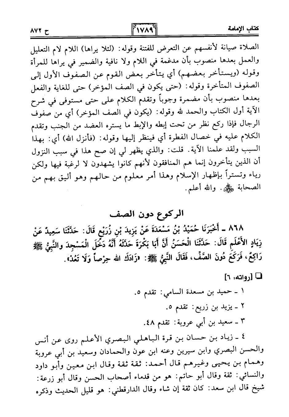 868 - أَخْبَرَنَا حُمَيْدُ بْنُ مَسْعَدَةَ عَنْ يَزِيدَ بْنِ زُرَيْعٍ قَالَ: حَدَّثنَا سَعِيدٌ عَنْ زِيَادٍ الأَعْلَمِ قَالَ: حَدَّثَنَا الْحَسَنُ أَنَّ أَبَا بَكْرَةَ حَدَّثَهُ أنهُ دَخَلَ الْمَسْجِدَ والنَّبِيُّ - صلى الله عليه وسلم - رَاكِعٌ، فَرَكَعَ دُونَ الصَّفِّ، فَقَالَ النَّبِيُّ - صلى الله عليه وسلم -: "زَادَكَ الله حِرْصًا وَلَا تَعُدْ".