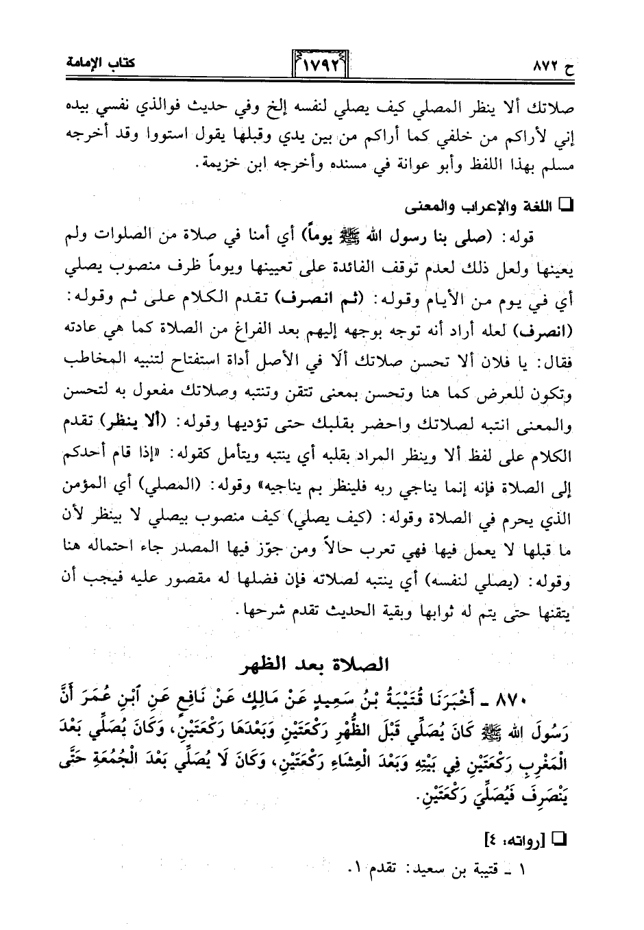 870 - أخْبَرَنَا قُتَيْبَةُ بْنُ سَعِيدٍ عَنْ مَالِكٍ عَنْ نَافِعٍ عَنِ ابْنِ عُمَرَ أَنَّ رَسُولَ الله - صلى الله عليه وسلم - كَانَ يُصَلِّي قَبْلَ الظُّهْرِ رَكْعَتَيْنِ وَبَعْدَهَا رَكْعَتَيْنِ، وَكَانَ يُصلِّي بَعْدَ الْمَغْرِبِ رَكعَتَيْنِ في بَيْتِهِ وَبَعْدَ الْعِشَاءِ رَكْعَتَيْنِ، وَكَانَ لَا يصلي بَعْدَ الْجُمُعَةِ حَتَّى يَنْصَرِفَ فَيُصَلِّيَ رَكْعَتَيْنِ.