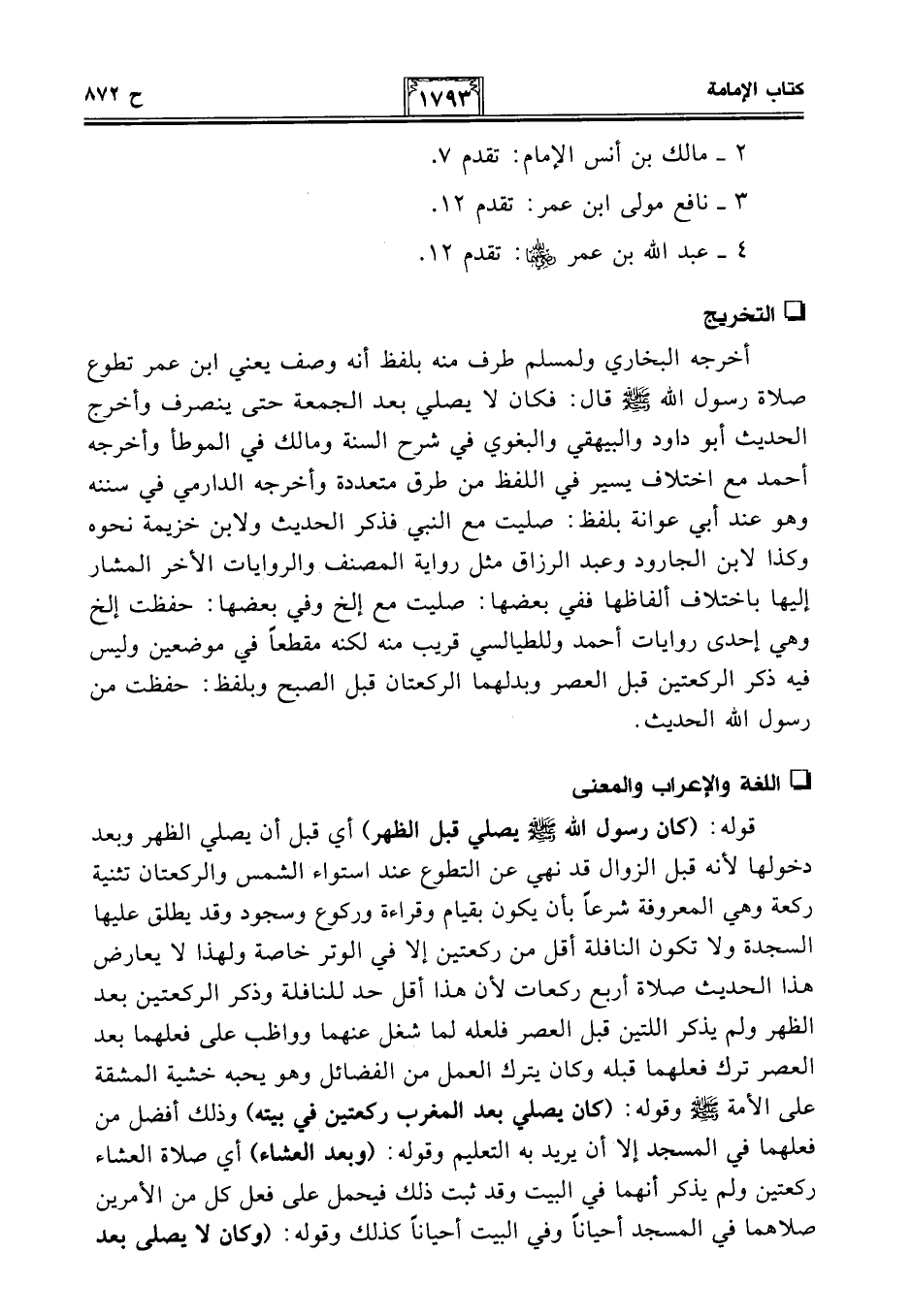 أخرجه البخاري ولمسلم طرف منه بلفظ أنه وصف يعني ابن عمر تطوع صلاة رسول الله - صلى الله عليه وسلم - قال: فكان لا يصلي بعد الجمعة حتى ينصرف وأخرج الحديث أبو داود والبيهقي والبغوي في شرح السنة ومالك في الموطأ وأخرجه أحمد مع اختلاف يسير في اللفظ من طرق متعددة وأخرجه الدارمي في سننه وهو عند أبي عوانة بلفظ: صليت مع النبي فذكر الحديث ولابن خزيمة نحوه وكذا لابن الجارود وعبد الرزاق مثل رواية المصنف والروايات الأخر المشار إليها باختلاف ألفاظها ففي بعضها: صليت مع إلخ وفي بعضها: حفظت إلخ وهي إحدى روايات أحمد وللطيالسي قريب منه لكنه مقطعًا في موضعين وليس فيه ذكر الركعتين قبل العصر وبدلهما الركعتان قبل الصبح وبلفظ: حفظت من رسول الله الحديث.