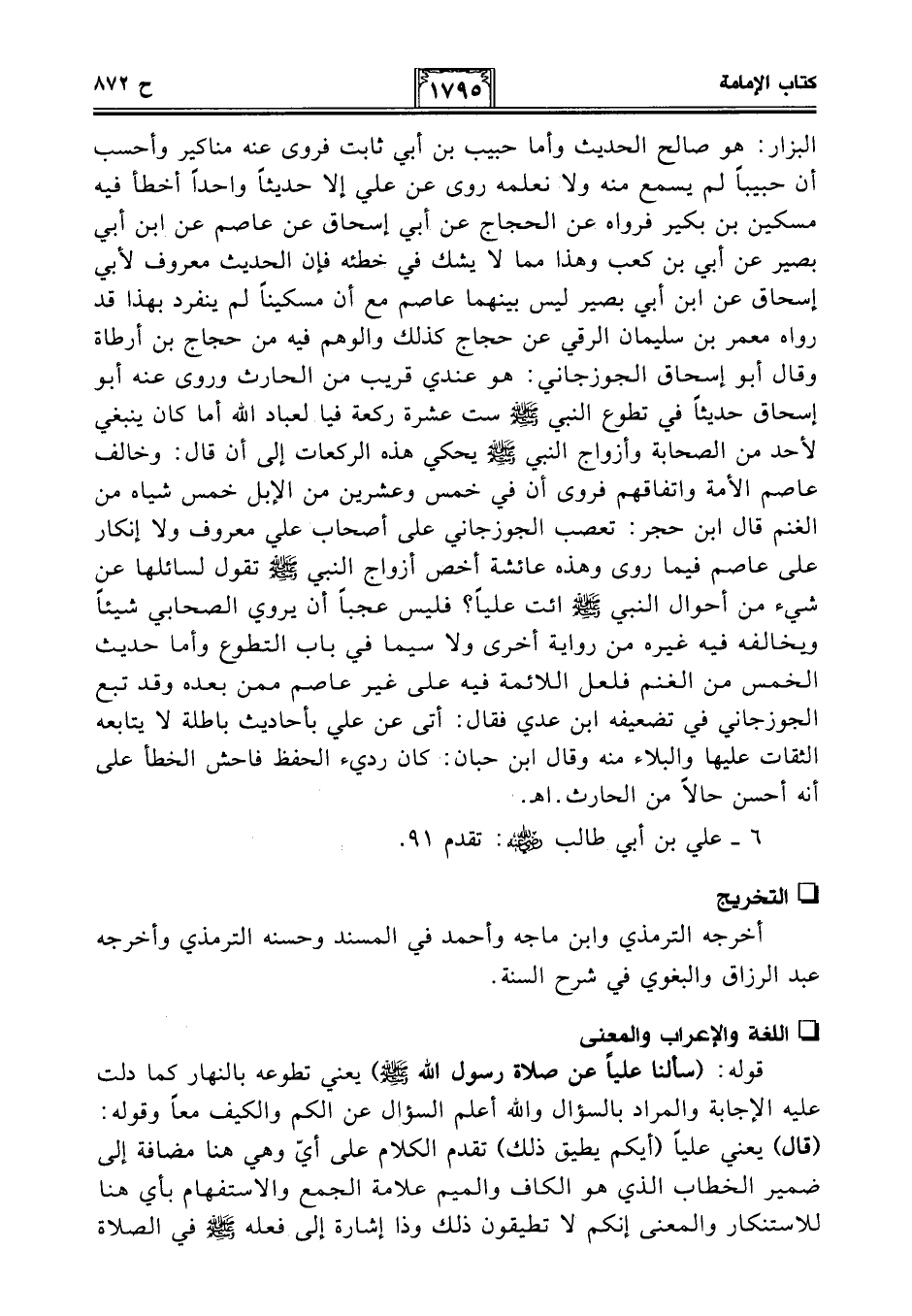 البزار: هو صالح الحديث وأما حبيب بن أبي ثابت فروى عنه مناكير وأحسب أن حبيبًا لم يسمع منه ولا نعلمه روى عن علي إلا حديثًا واحدًا أخطأ فيه مسكين بن بكير فرواه عن الحجاج عن أبي إسحاق عن عاصم عن ابن أبي بصير عن أبي بن كعب وهذا مما لا يشك في خطئه فإن الحديث معروف لأبي إسحاق عن ابن أبي بصير ليس بينهما عاصم مع أن مسكينًا لم ينفرد بهذا قد رواه معمر بن سليمان الرقي عن حجاج كذلك والوهم فيه من حجاج بن أرطاة وقال أبو إسحاق الجوزجاني: هو عندي قريب من الحارث وروى عنه أبو إسحاق حديثًا في تطوع النبي - صلى الله عليه وسلم - ست عشرة ركعة فيا لعباد الله أما كان ينبغي لأحد من الصحابة وأزواج النبي - صلى الله عليه وسلم - يحكي هذه الركعات إلى أن قال: وخالف عاصم الأمة واتفاقهم فروى أن في خمس وعشرين من الإبل خمس شياه من الغنم قال ابن حجر: تعصب الجوزجاني على أصحاب علي معروف ولا إنكار على عاصم فيما روى وهذه عائشة أخص أزواج النبي - صلى الله عليه وسلم - تقول لسائلها عن شيء من أحوال النبي - صلى الله عليه وسلم - ائت عليًا؟ فليس عجبًا أن يروي الصحابي شيئًا ويخالفه فيه غيره من رواية أخرى ولا سيما في باب التطوع وأما حديث الخمس من الغنم فلعل اللائمة فيه على غير عاصم ممن بعده وقد تبع الجوزجاني في تضعيفه ابن عدي فقال: أتى عن علي بأحاديث باطلة لا يتابعه الثقات عليها والبلاء منه وقال ابن حبان: كان رديء الحفظ فاحش الخطأ على أنه أحسن حالًا من الحارث. اهـ.