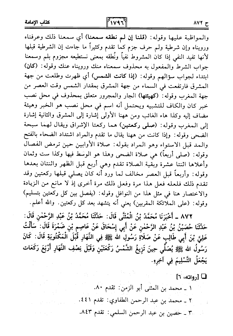 872 - أَخْبَرَنَا مُحَمَّدُ بْن الْمُثَنَّى قَالَ: حَدَّثنَا مُحَمَّدُ بْنُ عَبْدِ الرَّحْمنِ قَالَ: حَدَّثنَا حُصَيْنُ بْنُ عَبْدِ الرَّحْمنِ عَنْ أَبِي إِسْحَاقَ عَنْ عَاصِمٍ بْنِ ضَمْرَةَ قَالَ: سَأَلْتُ عَلِيَّ بْنَ أَبِي طَالِبٍ عَنْ صَلَاةِ رَسُولِ الله - صلى الله عليه وسلم - في النَّهَارِ قَبْلَ الْمَكْتُوبَةِ قَالَ: كَانَ رَسُولُ الله - صلى الله عليه وسلم - يُصَلِّي حِينَ تَزِيغُ الشَّمْسُ رَكْعَتَيْنِ وَقَبْلَ نِصْفِ النَّهَارِ أَرْبَعَ رَكَعَات يَجْعَلُ التَّسْلِيمَ في آخِرِهِ.