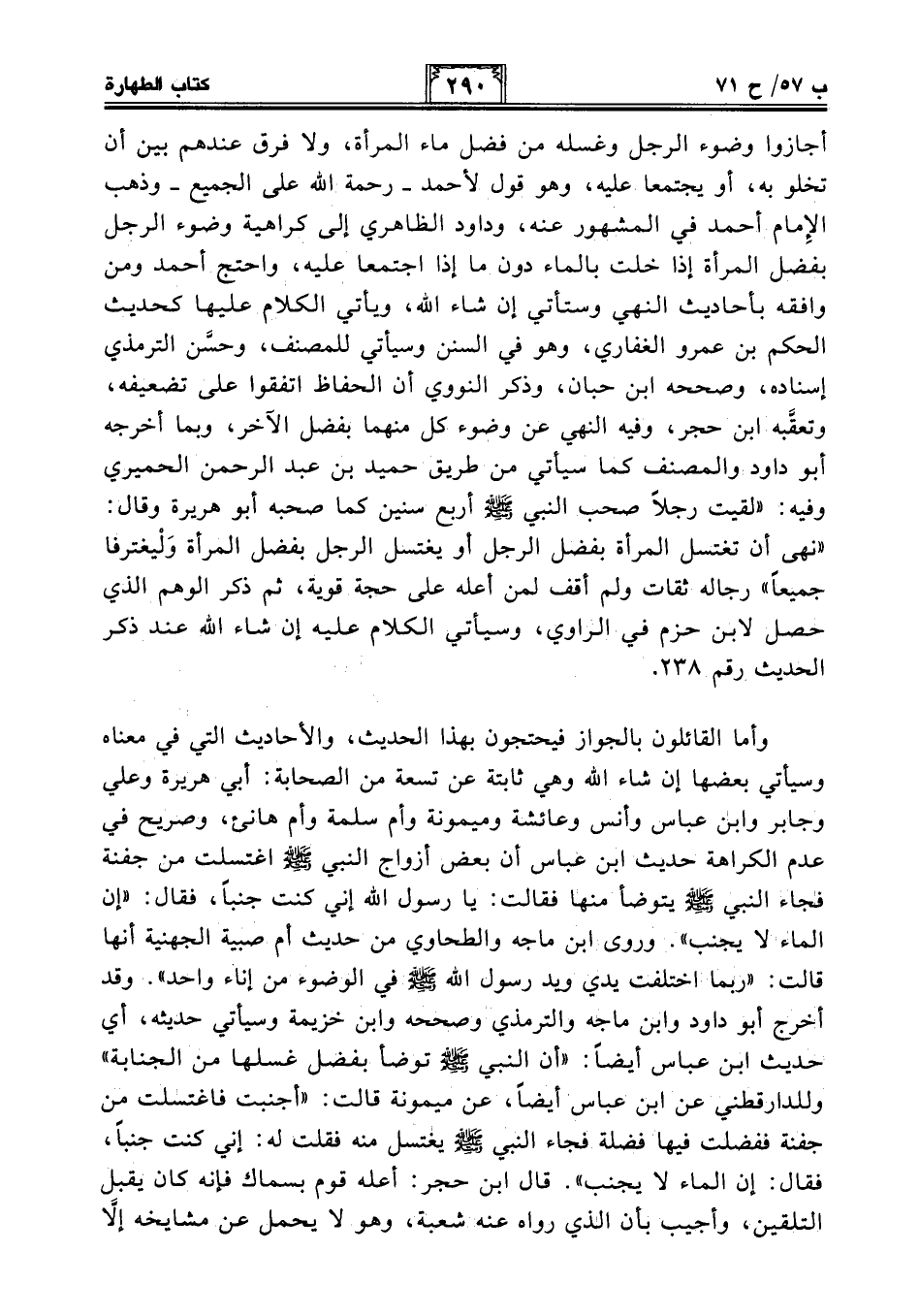 وأما القائلون بالجواز فيحتجون بهذا الحديث، والأحاديث التي في معناه وسيأتي بعضها إن شاء الله وهي ثابتة عن تسعة من الصحابة: أبي هريرة وعلي وجابر وابن عباس وأنس وعائشة وميمونة وأم سلمة وأم هانئ، وصريح في عدم الكراهة حديث ابن عباس أن بعض أزواج النبي - صلى الله عليه وسلم - اغتسلت من جفنة فجاء النبي - صلى الله عليه وسلم - يتوضأ منها فقالت: يا رسول الله إني كنت جنبًا، فقال: "إن الماء لا يجنب". وروى ابن ماجه والطحاوي من حديث أم صبية الجهنية أنها قالت: "ربما اختلفت يدي ويد رسول الله - صلى الله عليه وسلم - في الوضوء من إناء واحد". وقد أخرج أبو داود وابن ماجه والترمذي وصححه وابن خزيمة وسيأتي حديثه، أي حديث ابن عباس أيضًا: "أن النبي - صلى الله عليه وسلم - توضأ بفضل غسلها من الجنابة" وللدارقطني عن ابن عباس أيضًا، عن ميمونة قالت: "أجنبت فاغتسلت من جفنة ففضلت فيها فضلة فجاء النبي - صلى الله عليه وسلم - يغتسل منه فقلت له: إني كنت جنبًا، فقال: إن الماء لا يجنب". قال ابن حجر: أعله قوم بسماك فإنه كان يقبل التلقين، وأجيب بأن الذي رواه عنه شعبة، وهو لا يحمل عن مشايخه إلَّا
