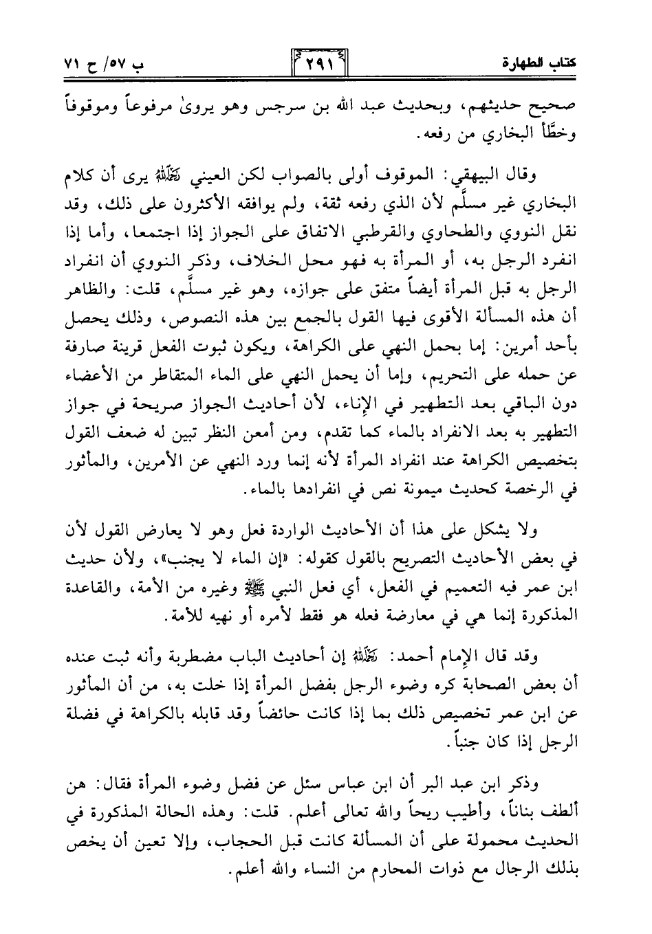 وقال البيهقي: الموقوف أولى بالصواب لكن العيني -رَحِمَه اللهُ- يرى أن كلام البخاري غير مسلَّم لأن الذي رفعه ثقة، ولم يوافقه الأكثرون على ذلك، وقد نقل النووي والطحاوي والقرطبي الاتفاق على الجواز إذا اجتمعا، وأما إذا انفرد الرجل به، أو المرأة به فهو محل الخلاف، وذكر النووي أن انفراد الرجل به قبل المرأة أيضًا متفق على جوازه، وهو غير مسلَّم، قلت: والظاهر أن هذه المسألة الأقوى فيها القول بالجمع بين هذه النصوص، وذلك يحصل بأحد أمرين: إما بحمل النهي على الكراهة، ويكون ثبوت الفعل قرينة صارفة عن حمله على التحريم، وإما أن يحمل النهي على الماء المتقاطر من الأعضاء دون الباقي بعد التطهير في الإِناء، لأن أحاديث الجواز صريحة في جواز التطهير به بعد الانفراد بالماء كما تقدم، ومن أمعن النظر تبين له ضعف القول بتخصيص الكراهة عند انفراد المرأة لأنه إنما ورد النهي عن الأمرين، والمأثور في الرخصة كحديث ميمونة نص في انفرادها بالماء.