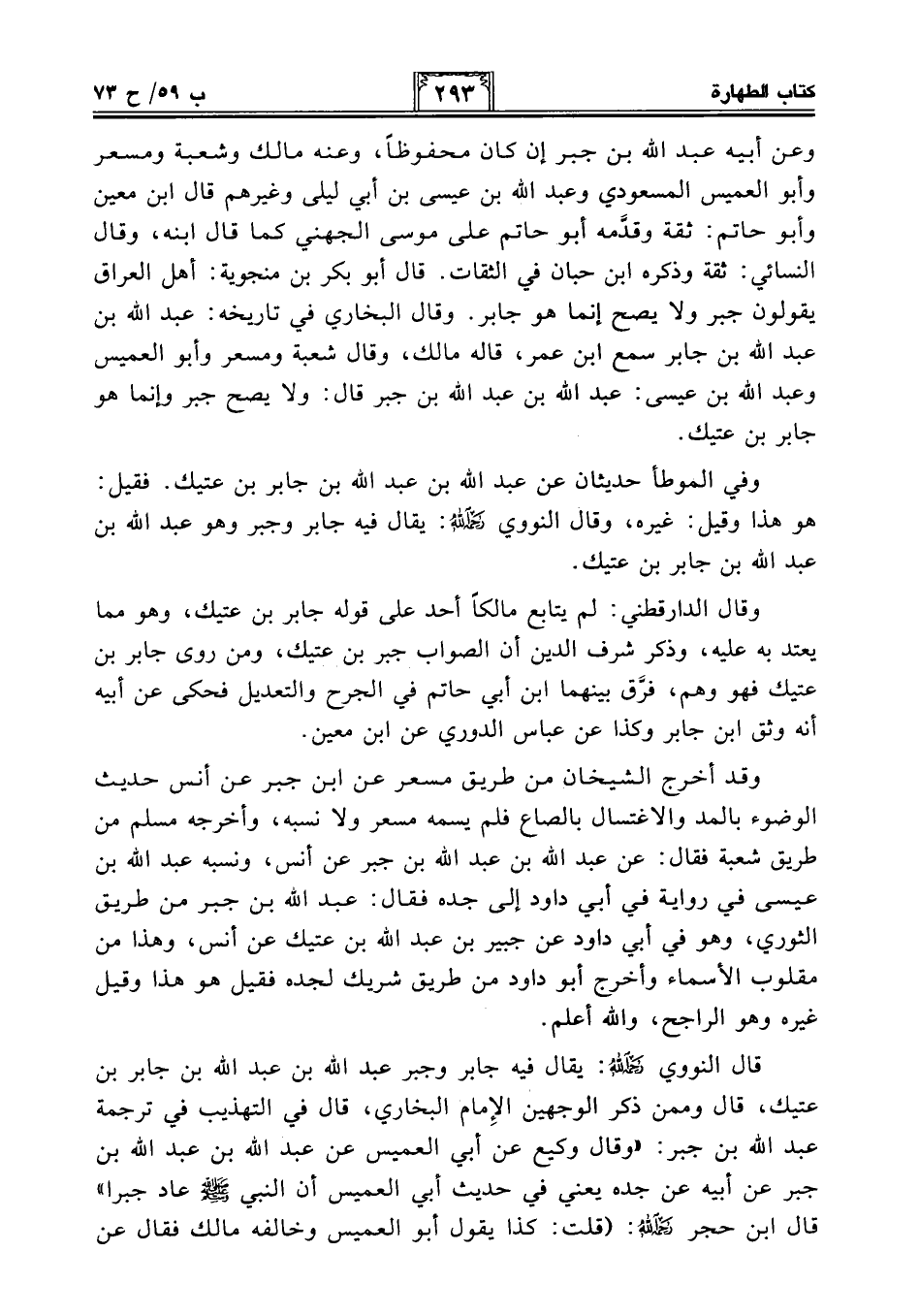 وقال الدارقطني: لم يتابع مالكًا أحد على قوله جابر بن عتيك، وهو مما يعتد به عليه، وذكر شرف الدين أن الصواب جبر بن عتيك، ومن روى جابر بن عتيك فهو وهم، فرَّق بينهما ابن أبي حاتم في الجرح والتعديل فحكى عن أبيه أنه وثق ابن جابر وكذا عن عباس الدوري عن ابن معين.
