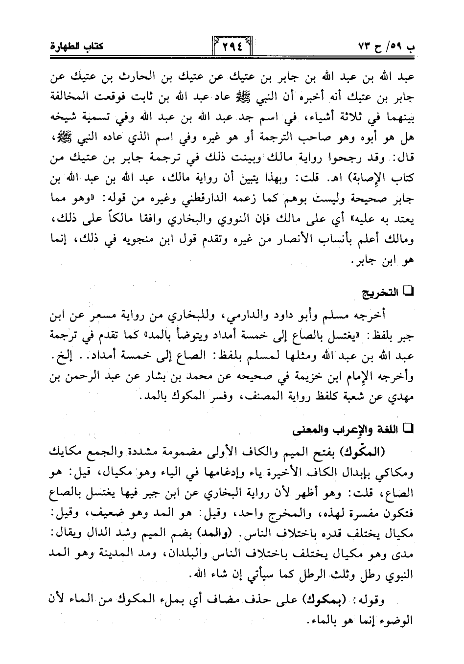 أخرجه مسلم وأبو داود والدارمي، وللبخاري من رواية مسعر عن ابن جبر بلفظ: "يغتسل بالصاع إلى خمسة أمداد ويتوضأ بالمد" كما تقدم في ترجمة عبد الله بن عبد الله ومثلها لمسلم بلفظ: الصاع إلى خمسة أمداد .. إلخ. وأخرجه الإِمام ابن خزيمة في صحيحه عن محمد بن بشار عن عبد الرحمن بن مهدي عن شعبة كلفظ رواية المصنف، وفسر المكوك بالمد.