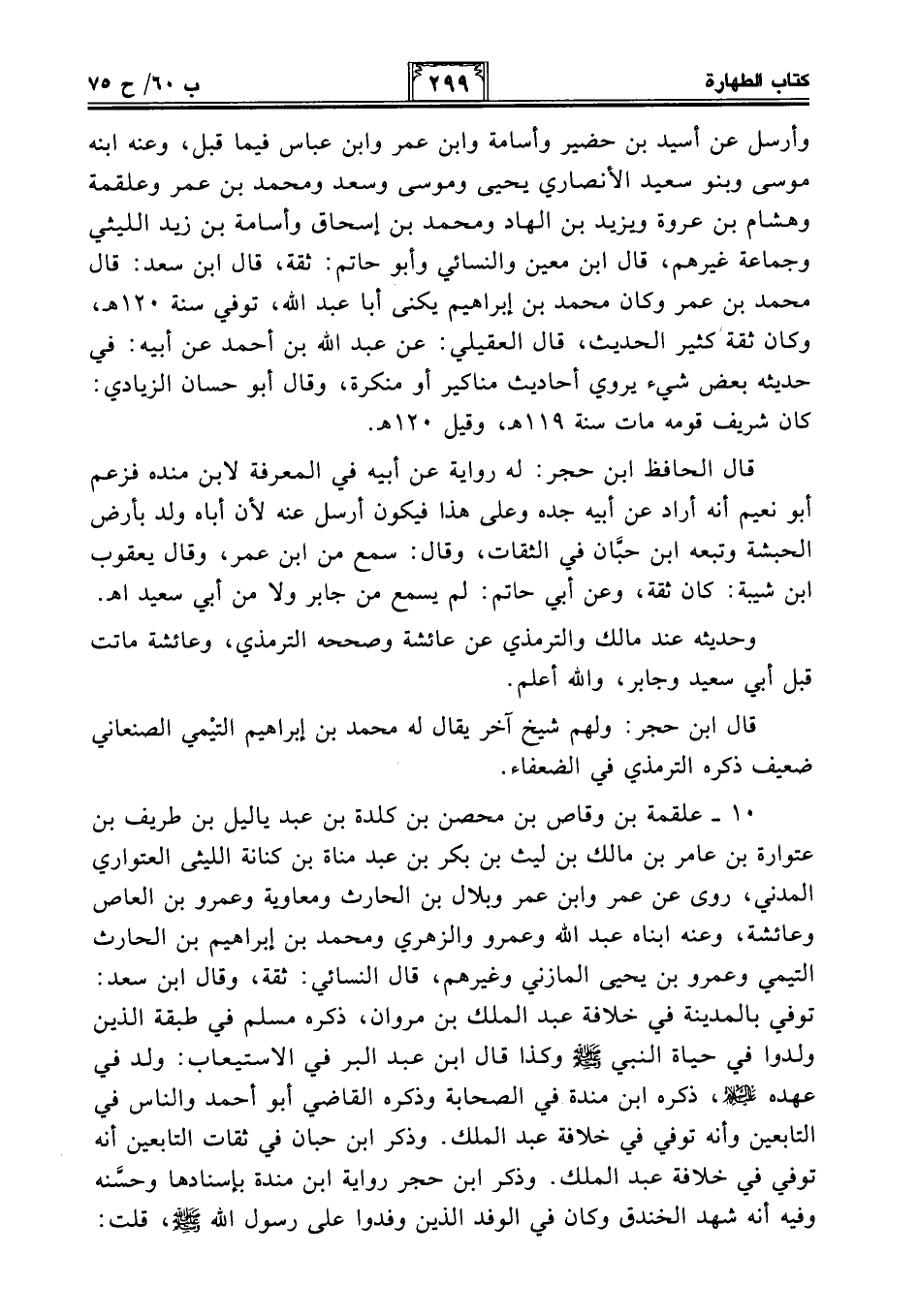 10 - علقمة بن وقاص بن محصن بن كلدة بن عبد ياليل بن طريف بن عتوارة بن عامر بن مالك بن ليث بن بكر بن عبد مناة بن كنانة الليثي العتواري المدني، روى عن عمر وابن عمر وبلال بن الحارث ومعاوية وعمرو بن العاص وعائشة، وعنه ابناه عبد الله وعمرو والزهري ومحمد بن إبراهيم بن الحارث التيمي وعمرو بن يحيى المازني وغيرهم، قال النسائي: ثقة، وقال ابن سعد: توفي بالمدينة في خلافة عبد الملك بن مروان، ذكره مسلم في طبقة الذين ولدوا في حياة النبي - صلى الله عليه وسلم - وكذا قال ابن عبد البر في الاستيعاب: ولد في عهده -عليه السلام-، ذكره ابن مندة في الصحابة وذكره القاضي أبو أحمد والناس في التابعين وأنه توفي في خلافة عبد الملك. وذكر ابن حبان في ثقات التابعين أنه توفي في خلافة عبد الملك. وذكر ابن حجر رواية ابن مندة بإسنادها وحسَّنه وفيه أنه شهد الخندق وكان في الوفد الذين وفدوا على رسول الله - صلى الله عليه وسلم -، قلت: