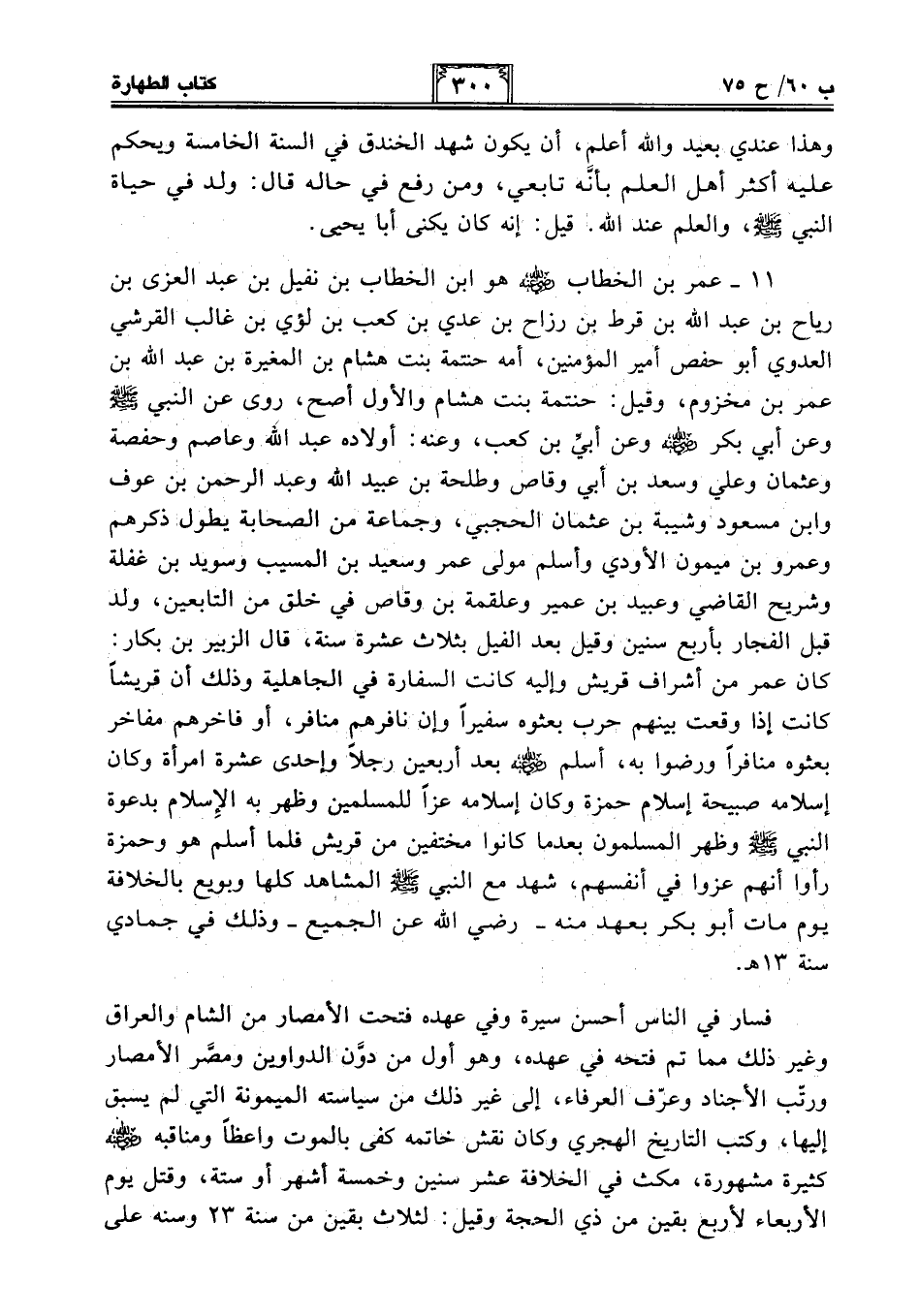 فسار في الناس أحسن سيرة وفي عهده فتحت الأمصار من الشام والعراق وغير ذلك مما تم فتحه في عهده، وهو أول من دوَّن الدواوين ومصَّر الأمصار ورتّب الأجناد وعرّف العرفاء، إلى غير ذلك من سياسته الميمونة التي لم يسبق إليها، وكتب التاريخ الهجري وكان نقش خاتمه كفى بالموت واعظًا ومناقبه - رضي الله عنه - كثيرة مشهورة، مكث في الخلافة عشر سنين وخمسة أشهر أو ستة، وقتل يوم الأربعاء لأربع بقين من ذي الحجة وقيل: لثلاث بقين من سنة 23 وسنه على