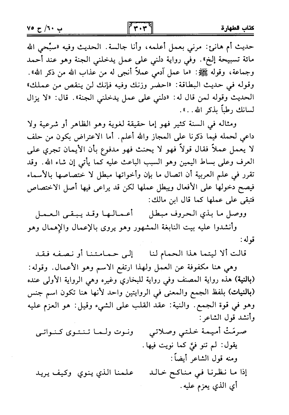 ومثاله في السنة كثير فهو إما حقيقة لغوية وهو الظاهر أو شرعية ولا داعي لحمله فيما ذكرنا على المجاز والله أعلم. أما الاعتراض بكون من حلف لا يعمل عملًا فقال قولًا فهو لا يحنث فهو مدفوع بأن الأيمان تجري على العرف وعلى بساط اليمين وهو السبب الباعث عليه كما يأتي إن شاء الله. وقد تقرر في علم العربية أن اتصال ما بإن وأخواتها مبطل لاختصاصها بالأسماء فيصح دخولها على الأفعال ويبطل عملها لكن قد يراعى فيها أصل الاختصاص فتبقى على عملها كما قال ابن مالك: