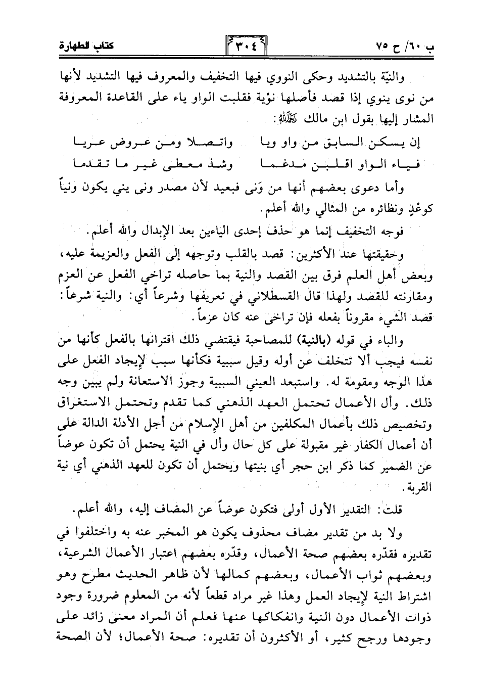 ولابد من تقدير مضاف محذوف يكون هو المخبر عنه به واختلفوا في تقديره فقدّره بعضهم صحة الأعمال، وقدّره بعضهم اعتبار الأعمال الشرعية، وبعضهم ثواب الأعمال، وبعضهم كمالها لأن ظاهر الحديث مطرح وهو اشتراط النية لإِيجاد العمل وهذا غير مراد قطعًا لأنه من المعلوم ضرورة وجود ذوات الأعمال دون النية وانفكاكها عنها فعلم أن المراد معنى زائد على وجودها ورجح كثير، أو الأكثرون أن تقديره: صحة الأعمال؛ لأن الصحة