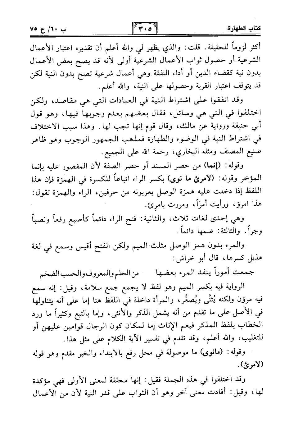 وقوله: (إنما) من حصر المسند أو حصر الصفة لأن المقصور عليه بإنما المؤخر وقوله: (لامرئ ما نوى) بكسر الراء اتباعًا للكسرة في الهمزة فإن هذا اللفظ إذا دخلت عليه همزة الوصل يعربونه من حرفين، الراء والهمزة تقول: هذا امرؤ، ورأيت أمرًا، ومررت بامرِئ.