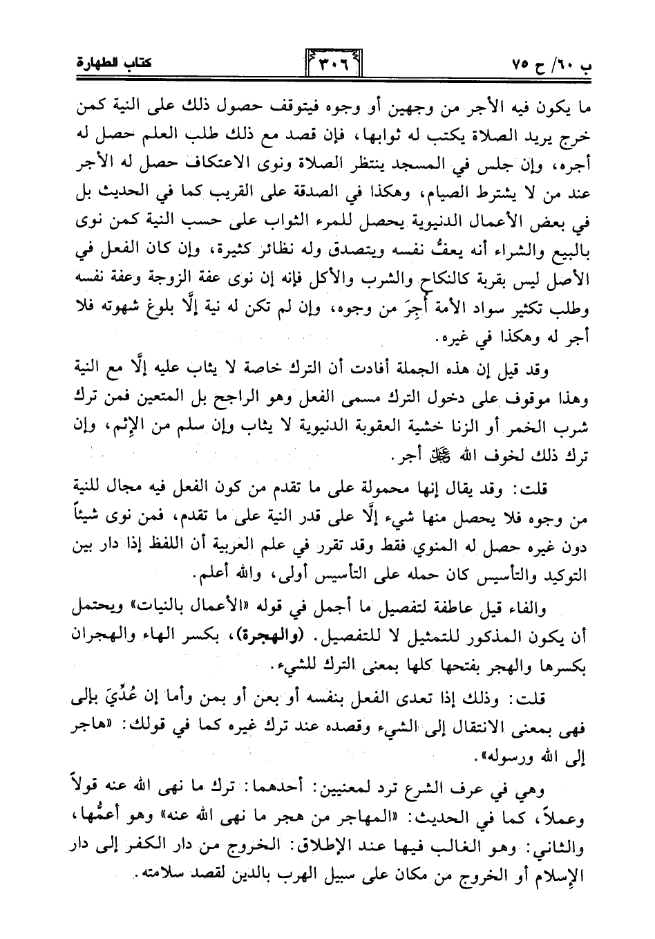 ما يكون فيه الأجر من وجهين أو وجوه فيتوقف حصول ذلك على النية كمن خرج يريد الصلاة يكتب له ثوابها، فإن قصد مع ذلك طلب العلم حصل له أجره، وإن جلس في المسجد ينتظر الصلاة ونوى الاعتكاف حصل له الأجر عند من لا يشترط الصيام، وهكذا في الصدقة على القريب كما في الحديث بل في بعض الأعمال الدنيوية يحصل للمرء الثواب على حسب النية كمن نوى بالبيع والشراء أنه يعفُّ نفسه ويتصدق وله نظائر كثيرة، وإن كان الفعل في الأصل ليس بقربة كالنكاح والشرب والأكل فإنه إن نوى عفة الزوجة وعفة نفسه وطلب تكثير سواد الأمة أُجِرَ من وجوه، وإن لم تكن له نية إلَّا بلوغ شهوته فلا أجر له وهكذا في غيره.