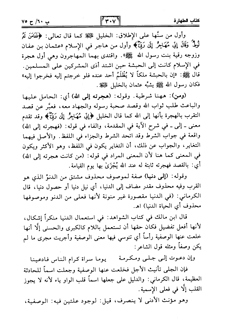 (ومن): هاهنا شرطية. وقوله: (هجرته إلى الله) أي: الحامل عليها والباعث طلب ثواب الله وقصد صحبة رسوله والجهاد معه، فعبَّر عن قصد التقرب بالهجرة بأنها إلى الله كما قال الخليل {إِنِّي مُهَاجِرٌ إِلَى رَبِّي} وقد تقدم معنى -إلى- في شرح الآية في المقدمة، والفاء في قوله: (فهجرته إلى الله) واقعة في جواب الشرط وقد اتحد الشرط والجزاء في اللفظ. والأصل فيهما التغاير، والجواب عن ذلك، أن التغاير يكون في اللفظ، وهو الأكثر ويكون في المعنى كما هنا لأن المعنى المراد في قوله: (من كانت هجرته إلى الله) أي: بالقصد فهجرته ثابتة له عند الله يُجْزَى بها يوم القيامة.