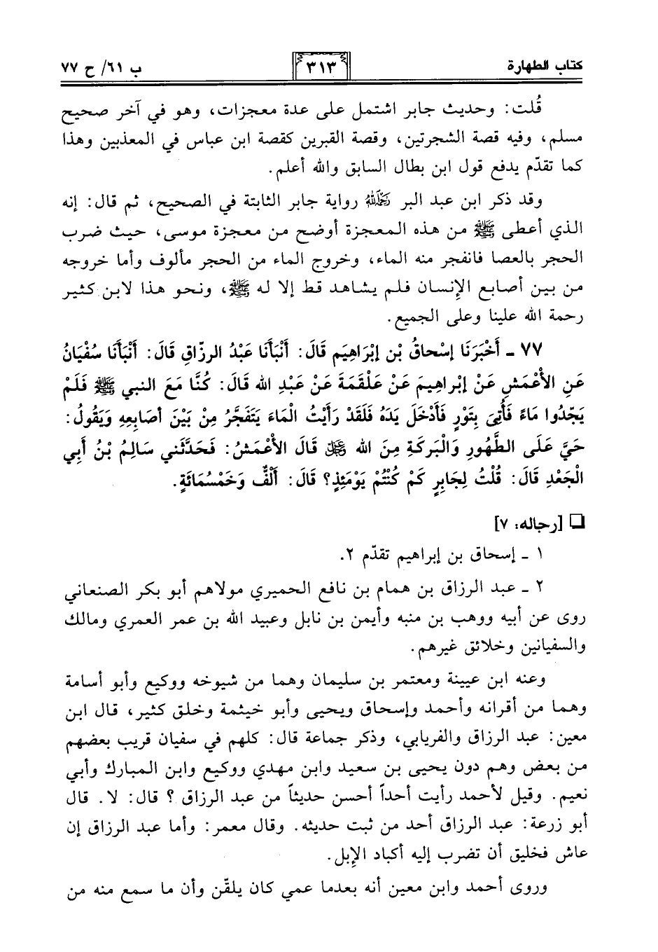77 - أَخْبَرَنَا إِسْحَاقُ بْنُ إِبْرَاهِيمَ قَالَ: أَنْبَأَنَا عَبْدُ الرَّزَّاقِ قَالَ: أَنْبَأَنَا سُفْيَانُ عَنِ الأَعْمَشِ عَنْ إِبْرَاهِيمَ عَنْ عَلْقَمَةَ عَنْ عَبْدِ اللَّهِ قَالَ: كُنَّا مَعَ النَّبِيِّ - صلى الله عليه وسلم - فَلَمْ يَجِدُوا مَاءً فَأُتِيَ بِتَوْرٍ فَأَدْخَلَ يَدَهُ فَلَقَدْ رَأَيْتُ الْمَاءَ يَتَفَجَّرُ مِنْ بَيْنِ أَصَابِعِهِ وَيَقُولُ: حَىَّ عَلَى الطَّهُورِ وَالْبَرَكَةِ مِنَ اللَّهِ -عَزَّ وَجَلَّ- قَالَ الأَعْمَشُ: فَحَدَّثَنِى سَالِمُ بْنُ أَبِي الْجَعْدِ قَالَ: قُلْتُ لِجَابِرٍ كَمْ كُنْتُمْ يَوْمَئِذٍ؟ قَالَ: أَلْفٌ وَخَمْسُمِائَةٍ.