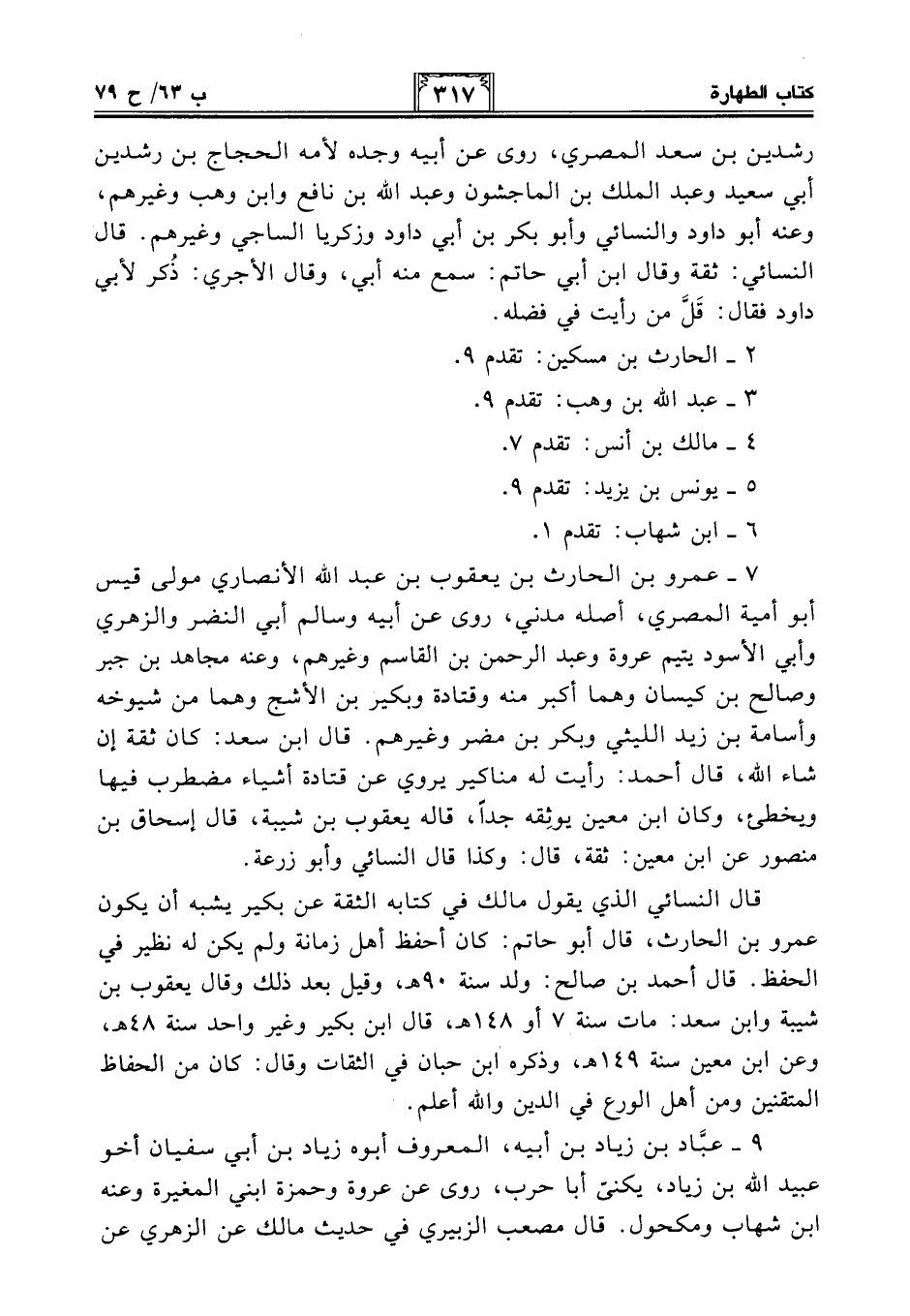 7 - عمرو بن الحارث بن يعقوب بن عبد الله الأنصاري مولى قيس أبو أمية المصري، أصله مدني، روى عن أبيه وسالم أبي النضر والزهري وأبي الأسود يتيم عروة وعبد الرحمن بن القاسم وغيرهم، وعنه مجاهد بن جبر وصالح بن كيسان وهما أكبر منه وقتادة وبكير بن الأشج وهما من شيوخه وأسامة بن زيد الليثي وبكر بن مضر وغيرهم. قال ابن سعد: كان ثقة إن شاء الله، قال أحمد: رأيت له مناكير يروي عن قتادة أشياء مضطرب فيها ويخطئ، وكان ابن معين يوثِقه جدًا، قاله يعقوب بن شيبة، قال إسحاق بن منصور عن ابن معين: ثقة، قال: وكذا قال النسائي وأبو زرعة.