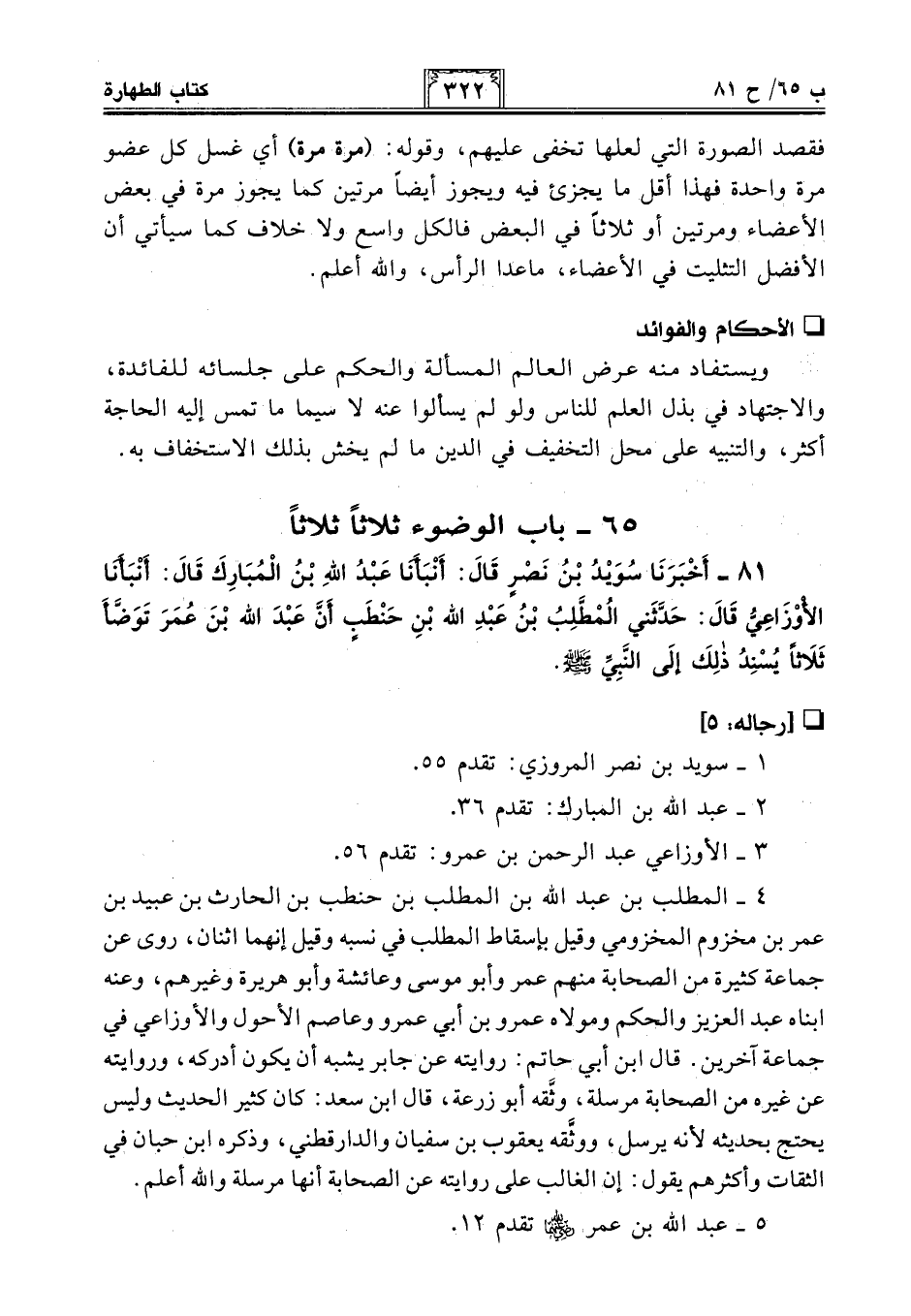81 - أَخْبَرَنَا سُوَيْدُ بْنُ نَصْرٍ قَالَ: أَنْبَأَنَا عَبْدُ اللَّهِ بْنُ الْمُبَارَكِ قَالَ: أَنْبَأَنَا الأَوْزَاعِيُّ قَالَ: حَدَّثَنِي الْمُطَّلِبُ بْنُ عَبْدِ اللَّهِ بْنِ حَنْطَبٍ أَنَّ عَبْدَ اللَّهِ بْنَ عُمَرَ تَوَضَّأَ ثَلَاثًا يُسْنِدُ ذَلِكَ إِلَى النَّبِيِّ - صلى الله عليه وسلم -.