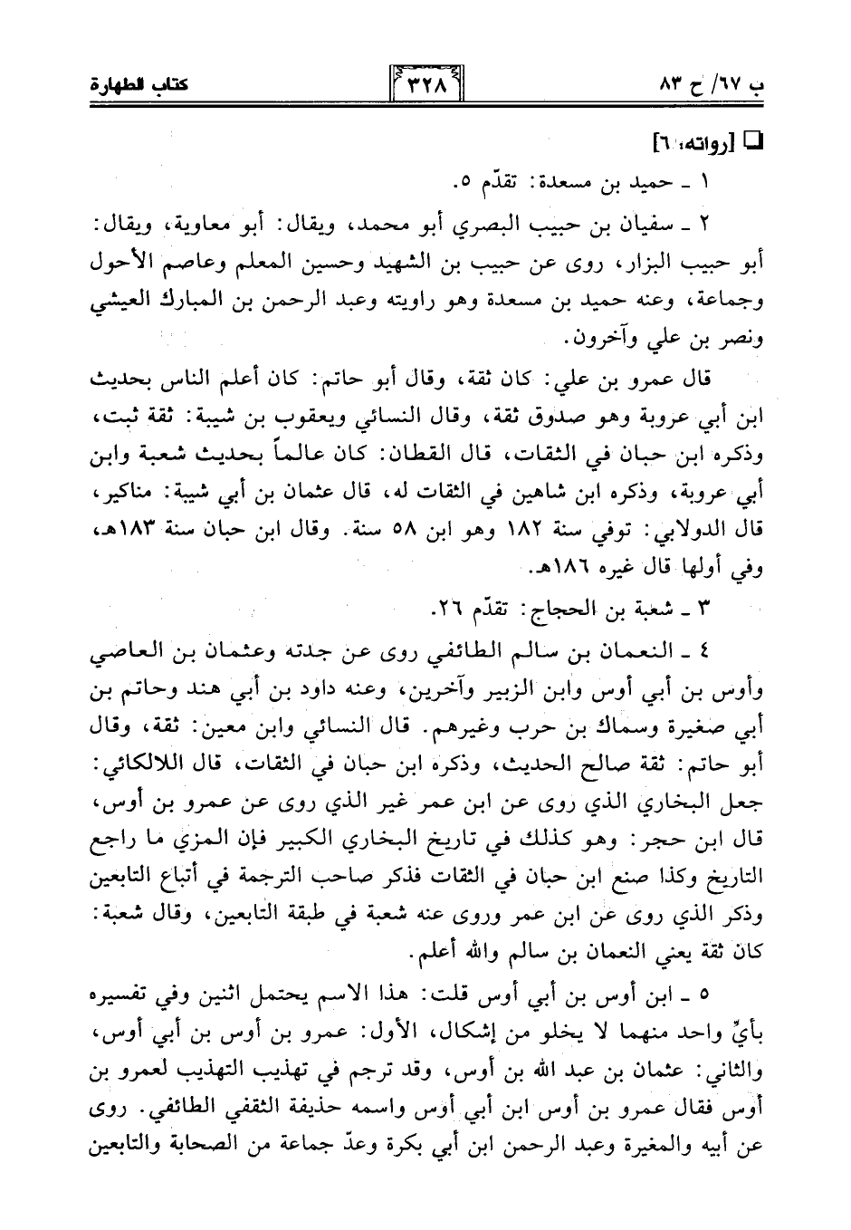 5 - ابن أوس بن أبي أوس قلت: هذا الاسم يحتمل اثنين وفي تفسيره بأيِّ واحد منهما لا يخلو من إشكال، الأول: عمرو بن أوس بن أبي أوس، والثاني: عثمان بن عبد الله بن أوس، وقد ترجم في تهذيب التهذيب لعمرو بن أوس فقال عمرو بن أوس ابن أبي أوس واسمه حذيفة الثقفي الطائفي. روى عن أبيه والمغيرة وعبد الرحمن ابن أبي بكرة وعدّ جماعة من الصحابة والتابعين