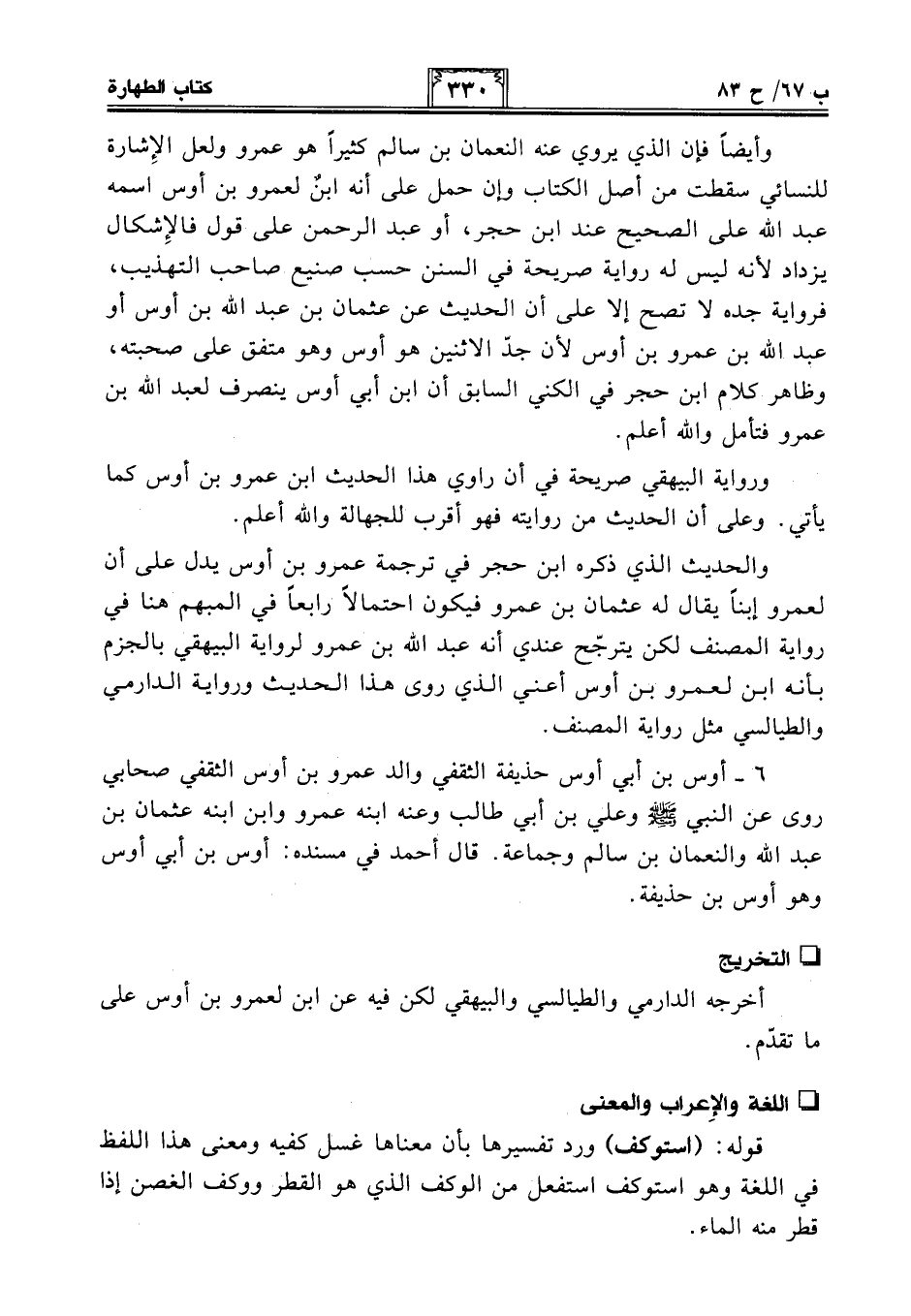 وأيضًا فإن الذي يروي عنه النعمان بن سالم كثيرًا هو عمرو ولعل الإِشارة للنسائي سقطت من أصل الكتاب وإن حمل على أنه ابنٌ لعمرو بن أوس اسمه عبد الله على الصحيح عند ابن حجر، أو عبد الرحمن على قول فالإِشكال يزداد لأنه ليس له رواية صريحة في السنن حسب صنيع صاحب التهذيب، فرواية جده لا تصح إلا على أن الحديث عن عثمان بن عبد الله بن أوس أو عبد الله بن عمرو بن أوس لأن جدّ الاثنين هو أوس وهو متفق على صحبته، وظاهر كلام ابن حجر في الكنى السابق أن ابن أبي أوس ينصرف لعبد الله بن عمرو فتأمل والله أعلم.
