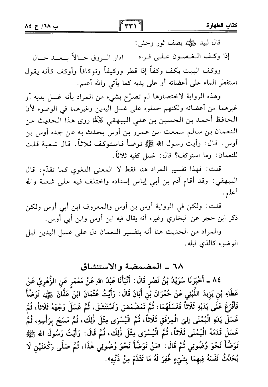 وهذه الرواية لاختصارها لم تصرّح بشيء من المراد بأنه غسل يديه أو غيرهما من أعضائه ولكنهم حملوه على غسل اليدين وغيرهما في الوضوء لأن الحافظ أحمد بن الحسين بن علي البيهقي -رحمه الله- روى هذا الحديث عن النعمان بن سالم سمعت ابن عمرو بن أوس يحدث به عن جده أوس بن أوس. قال: رأيت رسول الله - صلى الله عليه وسلم - توضأ فاستوكف ثلاثًا. قال شعبة قلت للنعمان: وما استوكف؟ قال: غسل كفيه ثلاثًا.