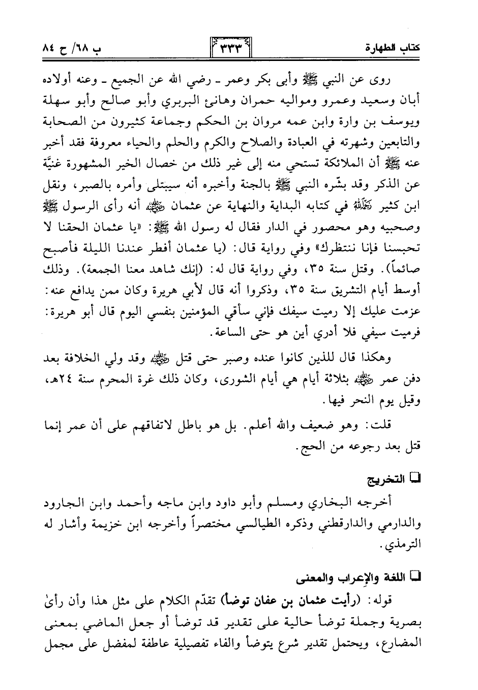 قوله: (رأيت عثمان بن عفان توضأ) تقدّم الكلام على مثل هذا وأن رأى بصرية وجملة توضأ حالية على تقدير قد توضأ أو جعل الماضي بمعنى المضارع، ويحتمل تقدير شرع يتوضأ والفاء تفصيلية عاطفة لمفضل على مجمل