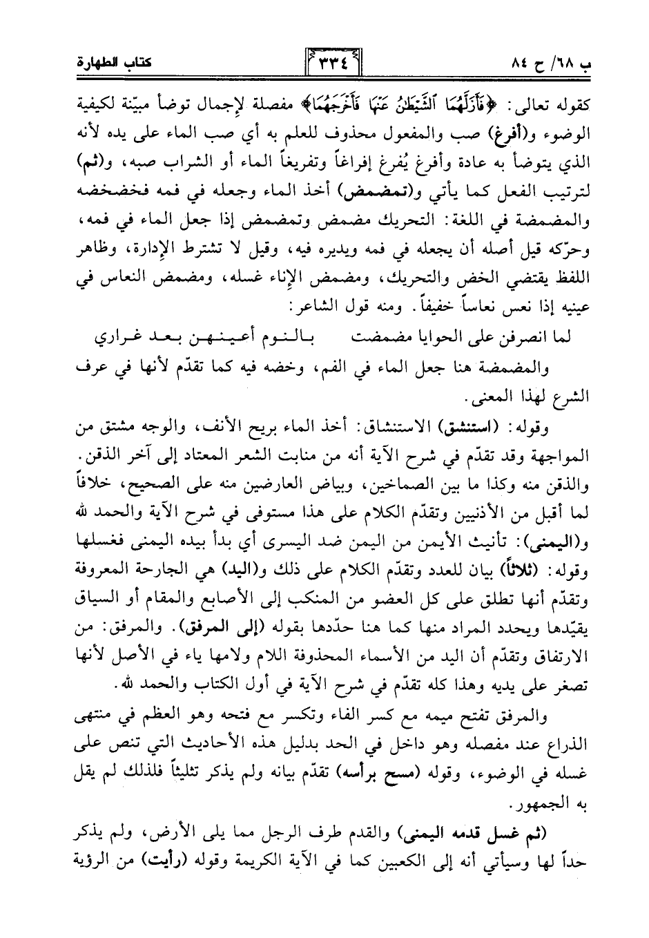 كقوله تعالى: {فَأَزَلَّهُمَا الشَّيْطَانُ عَنْهَا فَأَخْرَجَهُمَا} مفصلة لإِجمال توضأ مبيّنة لكيفية الوضوء و (أفرغ) صب والمفعول محذوف للعلم به أي صب الماء على يده لأنه الذي يتوضأ به عادة وأفرغ يُفرغ إفراغًا وتفريغًا الماء أو الشراب صبه، و (ثم) لترتيب الفعل كما يأتي و (تمضمض) أخذ الماء وجعله في فمه فخضخضه والمضمضة في اللغة: التحريك مضمض وتمضمض إذا جعل الماء في فمه، وحرّكه قيل أصله أن يجعله في فمه ويديره فيه، وقيل لا تشترط الإِدارة، وظاهر اللفظ يقتضي الخض والتحريك، ومضمض الإِناء غسله، ومضمض النعاس في عينيه إذا نعس نعاسًا خفيفًا. ومنه قول الشاعر: