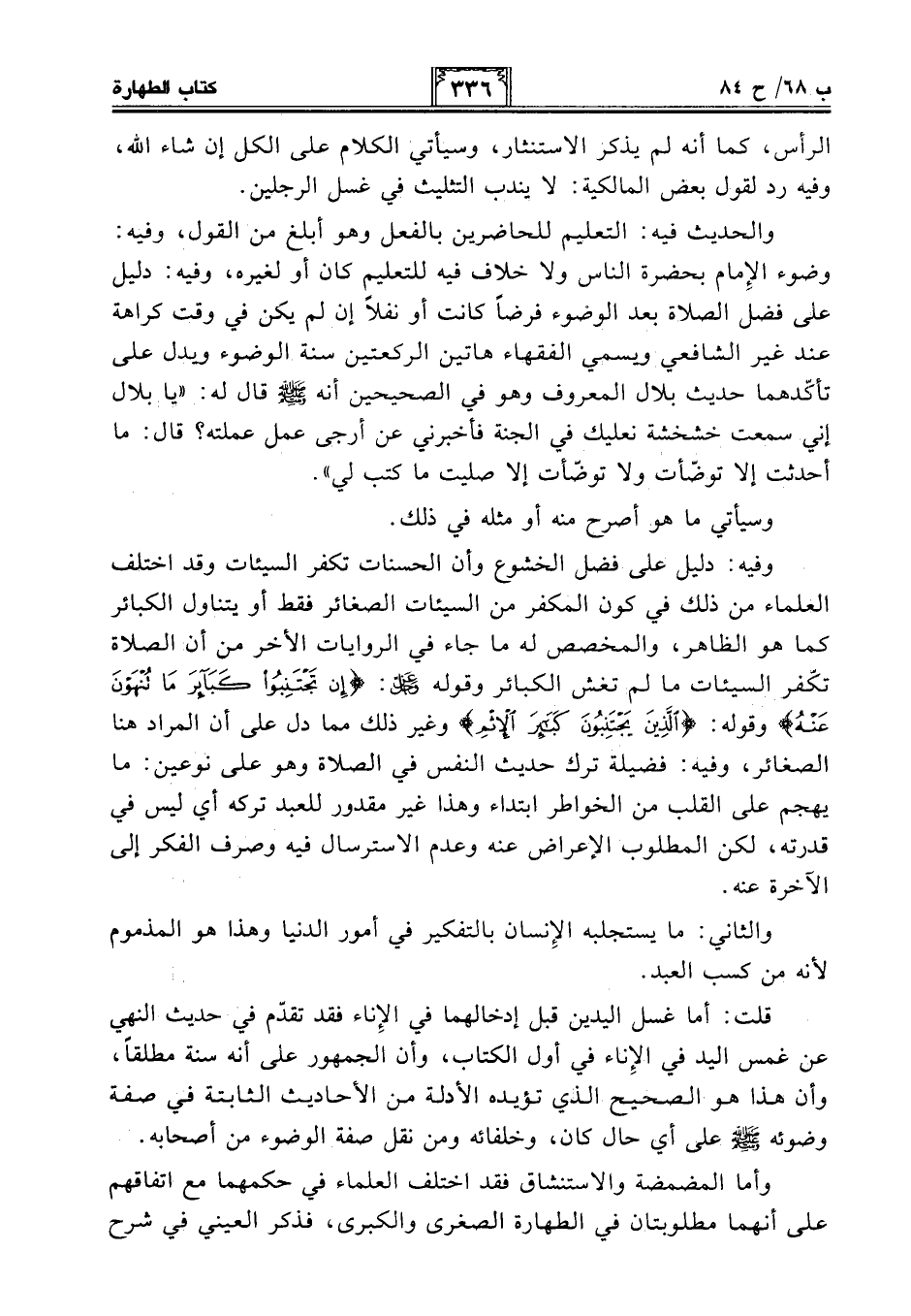 الرأس، كما أنه لم يذكر الاستنثار، وسيأتي الكلام على الكل إن شاء الله، وفيه رد لقول بعض المالكية: لا يندب التثليث في غسل الرجلين.