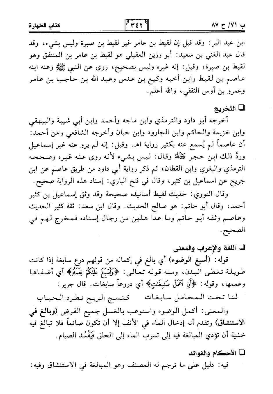 والمعنى: أكمل الوضوء واستوعب بالغسل جميع الفرض (وبالغ في الإستنشاق) وتقدم أنه إدخال الماء في الأنف إلا أن تكون صائمًا فلا تبالغ فيه خشية أن تؤدي المبالغة فيه إلى تسرب الماء إلى الحلق فَيَفْسُد الصيام.