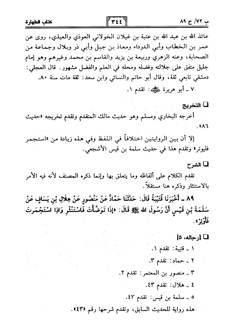 89 - أَخْبَرَنَا قُتَيْبَةُ قَالَ: حَدَّثَنَا حَمَّادٌ عَنْ مَنْصُورٍ عَنْ هِلَالِ بْنِ يِسَافٍ عَنْ سَلَمَةَ بْنِ قَيْسٍ أَنَّ رَسُولَ اللَّهِ - صلى الله عليه وسلم - قَالَ: "إِذَا تَوَضَّأْتَ فَاسْتَنْثِرْ وَإِذَا اسْتَجْمَرْتَ فَأَوْتِرْ".